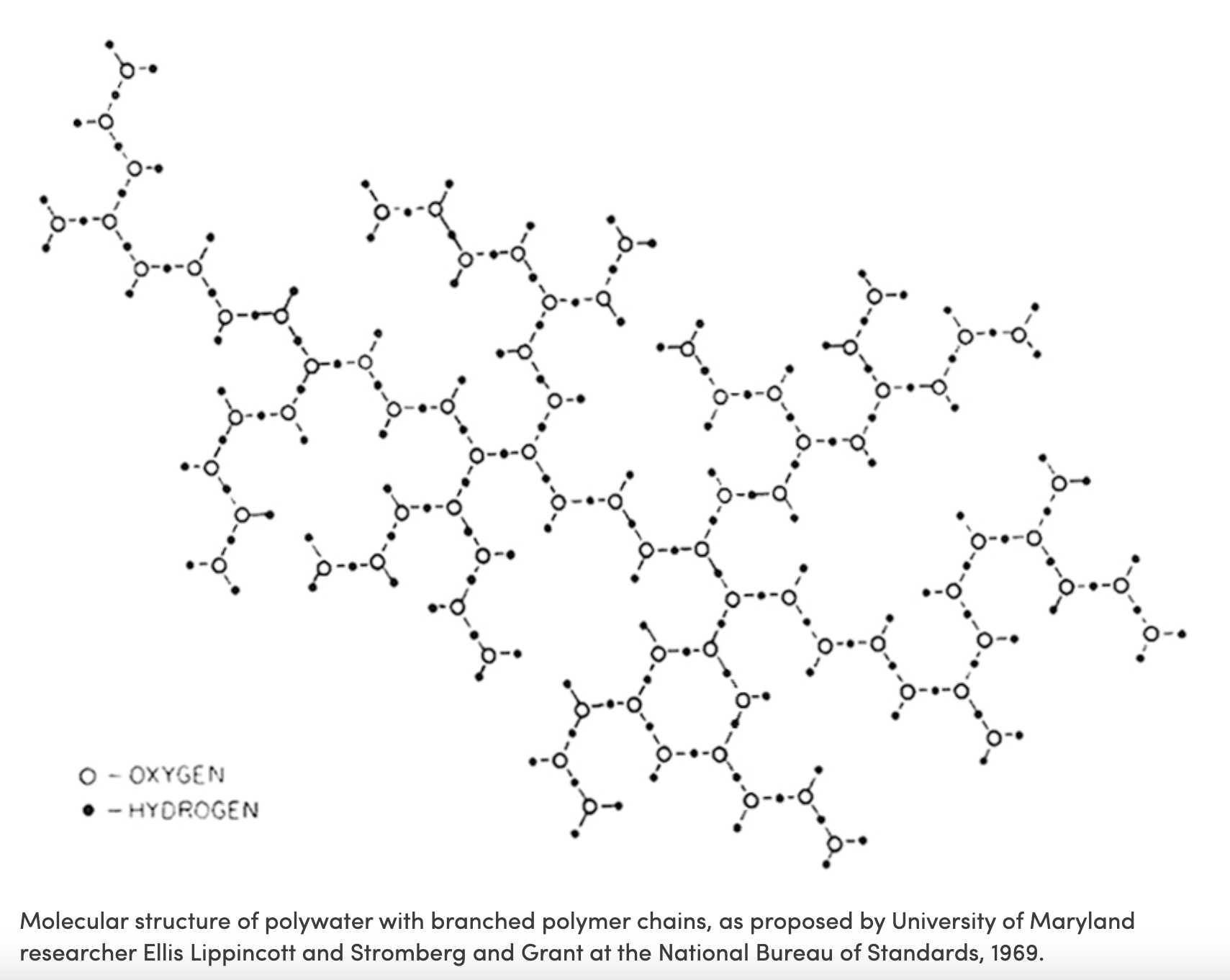 In the 1960s, Nikolai Fedyakin picked up on Lord Kelvin’s work at the Kostroma Technological Institute and through careful experimentation, concluded that the liquid at the bottom of the glass tube was denser than ordinary water and published his findings. Boris Deryagin, director of the Institute of Physical Chemistry in Moscow, was intrigued and his team confirmed that the substance at the bottom of the glass tube was denser and thicker than ordinary water and had additional anomalous properties. This phase of water had a thick, gel-like consistency; it also had a higher stability, like a polymer, over bulk water. It demonstrated a lower freezing point, a higher boiling point, and much higher density and viscosity than ordinary water. It expanded more than ordinary water when heated and bent light differently. Deryagin became convinced that this “modified water” was the most thermodynamically stable form of water and that any water that came into contact with it would become modified as well. In 1966, Deryagin shared his work in a paper entitled “Effects of Lyophile Surfaces on the Properties of Boundary Liquid Films.” British scientist Brian Pethica confirmed Deryagin’s findings with his own experiments—calling the odd liquid “anomalous water”—and published in Nature. In 1969, Ellis Lippincott and colleagues published their work using spectroscopic evidence of this anomalous water, showing that it was arranged in a honeycomb-shaped network, making a polymer of water—and dubbed it “polywater.” Scientists proposed that instead of the weak Van der Waals forces that normally draw water molecules together, the molecules of ‘polywater’ were locked in place by stronger bonds, catalyzed somehow by the nature of the surface they were adjacent to.
