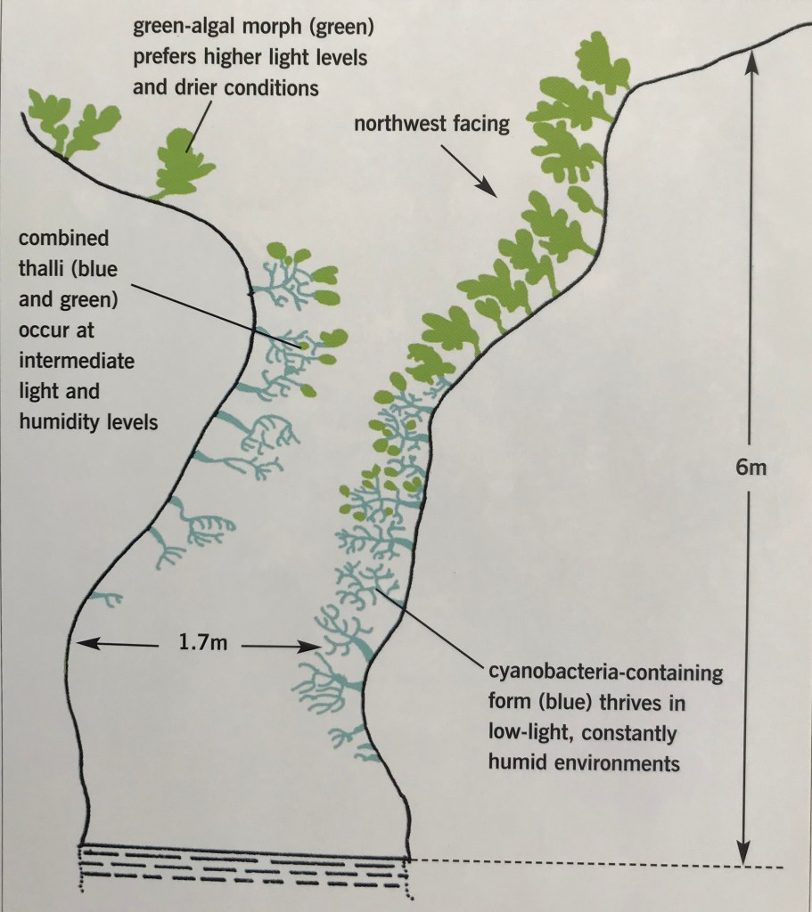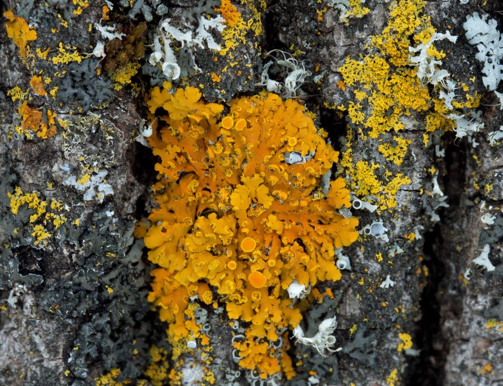 Just as with aquatic algae, the photobiont of a lichen can be damaged by too much light, particularly UV light, so it uses pigments as ‘sunscreen.’ Lichens with the most intense colours are those most exposed to sunlight and lack of moisture. This is why Xanthoria is bright yellow in sunny places and grey to green (depending on moisture) in shady places.