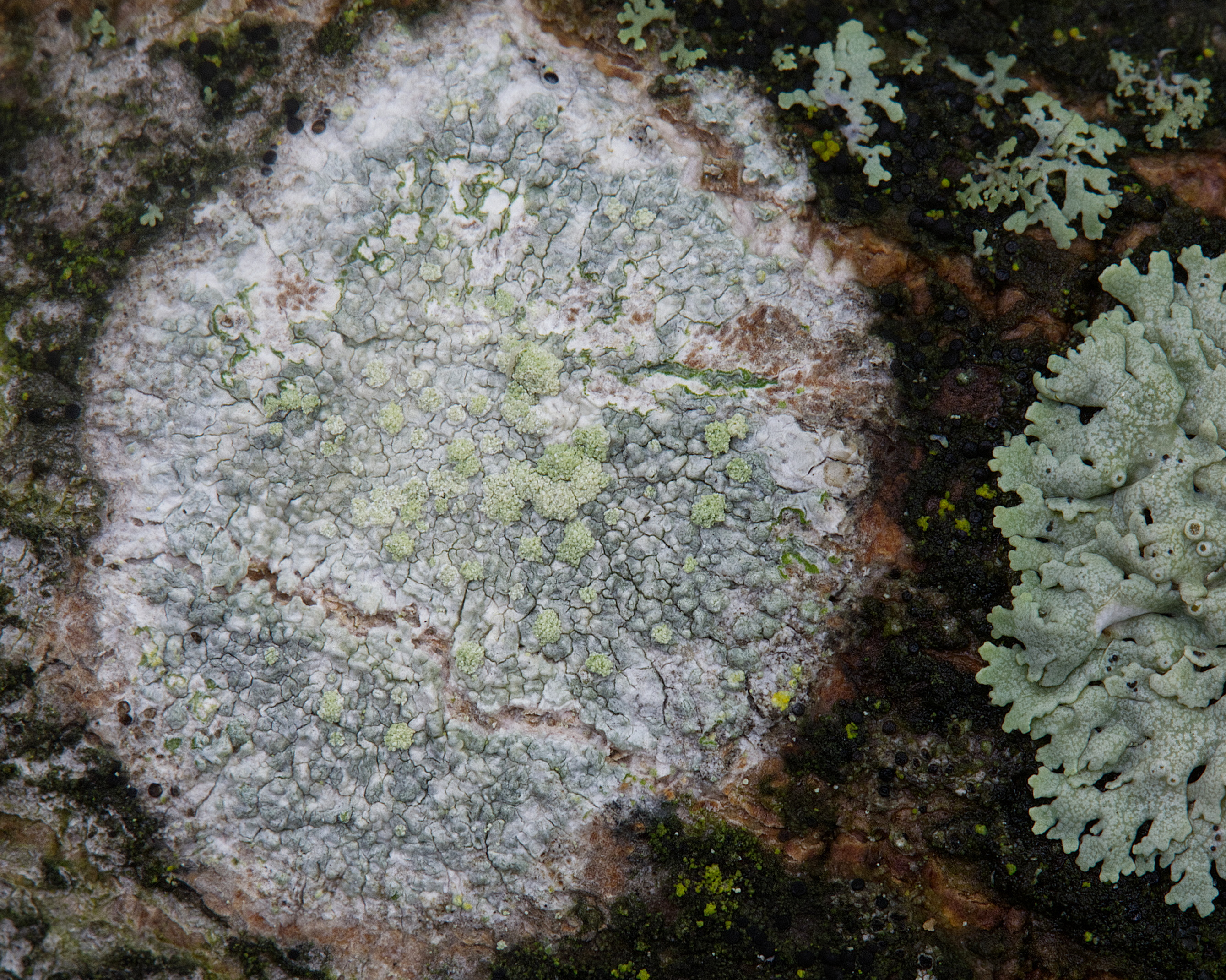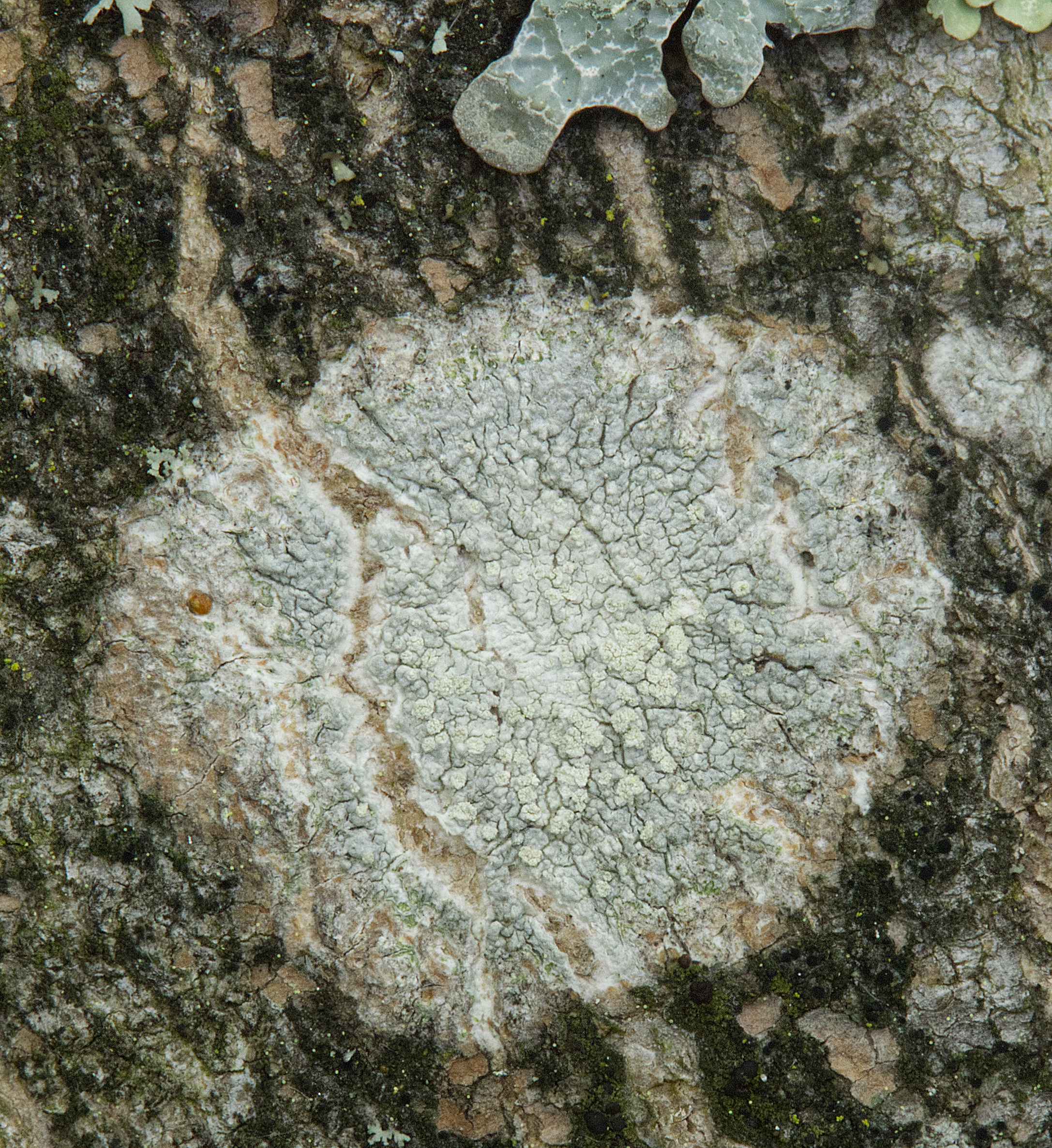 It was shortly after a long spring rain when I discovered this crustose lichen beside several other lichens I was examining on a fallen sugar maple branch from the earlier calamitous ice storm.