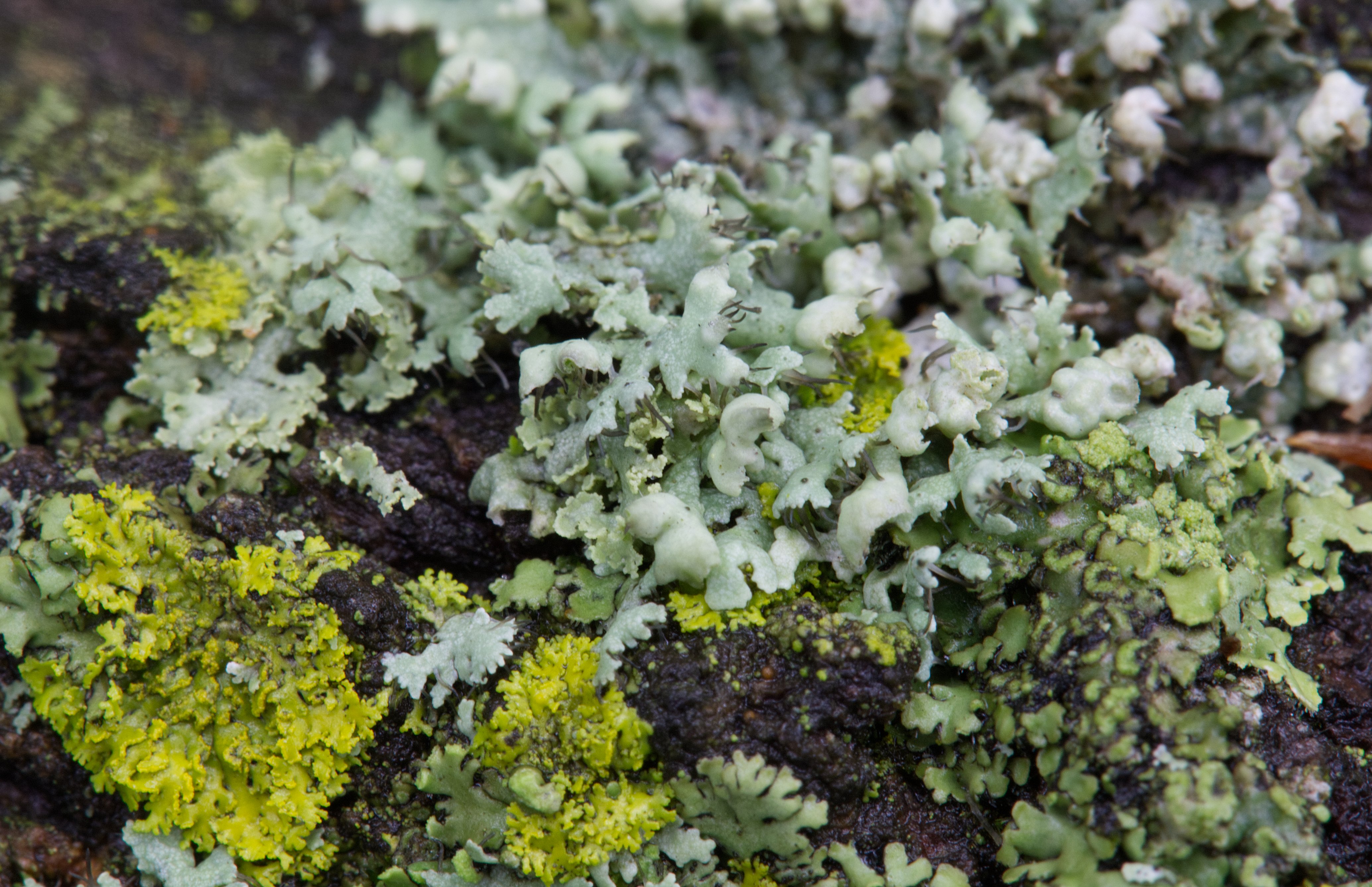 Amid the splashy larger lichen there was the understated crustose fluff-wart lichen, the Bitter Wart Lichen (Lepra amara [formerly Pertusaria amara]), adding small circular patches of whitish pale green to greenish grey thalli, weakly zoned at the margins. I’d seen Bitter Wart Lichen before on a poplar in another forest nearby. And here it was again, looking handsome with its pale greenish thallus and warts of yellow-green punctiform soralia.