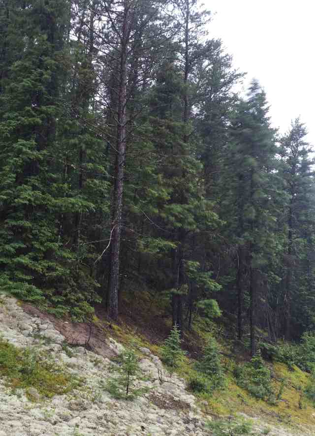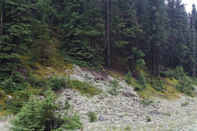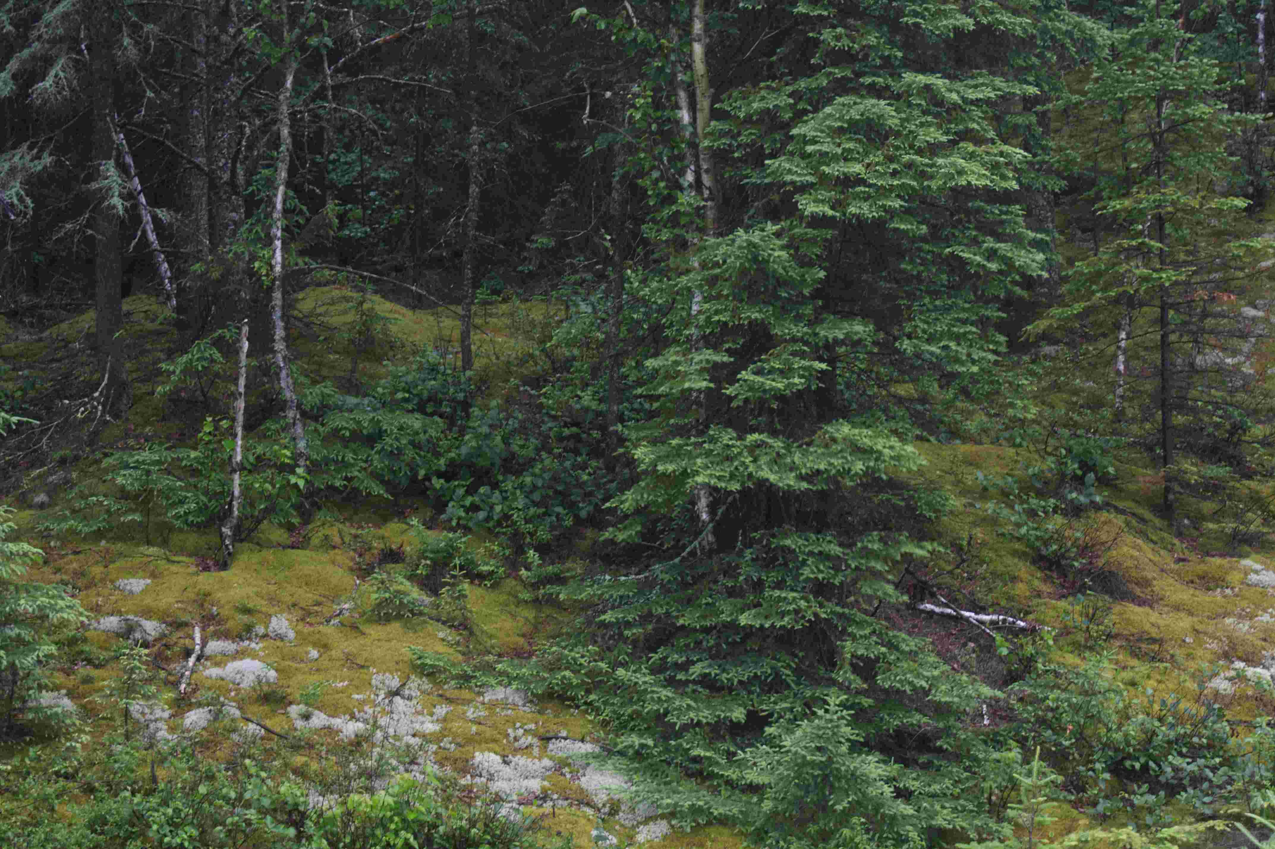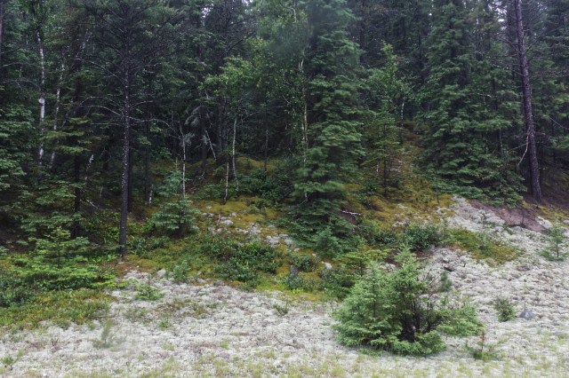 This is what I observed where I’d stopped the car by the side of the road; closer to the disturbance of the open road, reindeer lichens—likely Cladonia rangiferina, C. mitis and C. stellaris—formed a thick continuous mat on the ground, which was fairly open with young spruce growing here and there. Further up the slope, where the canopy became more closed and shaded with mature trees, the mosses dominated the ground.