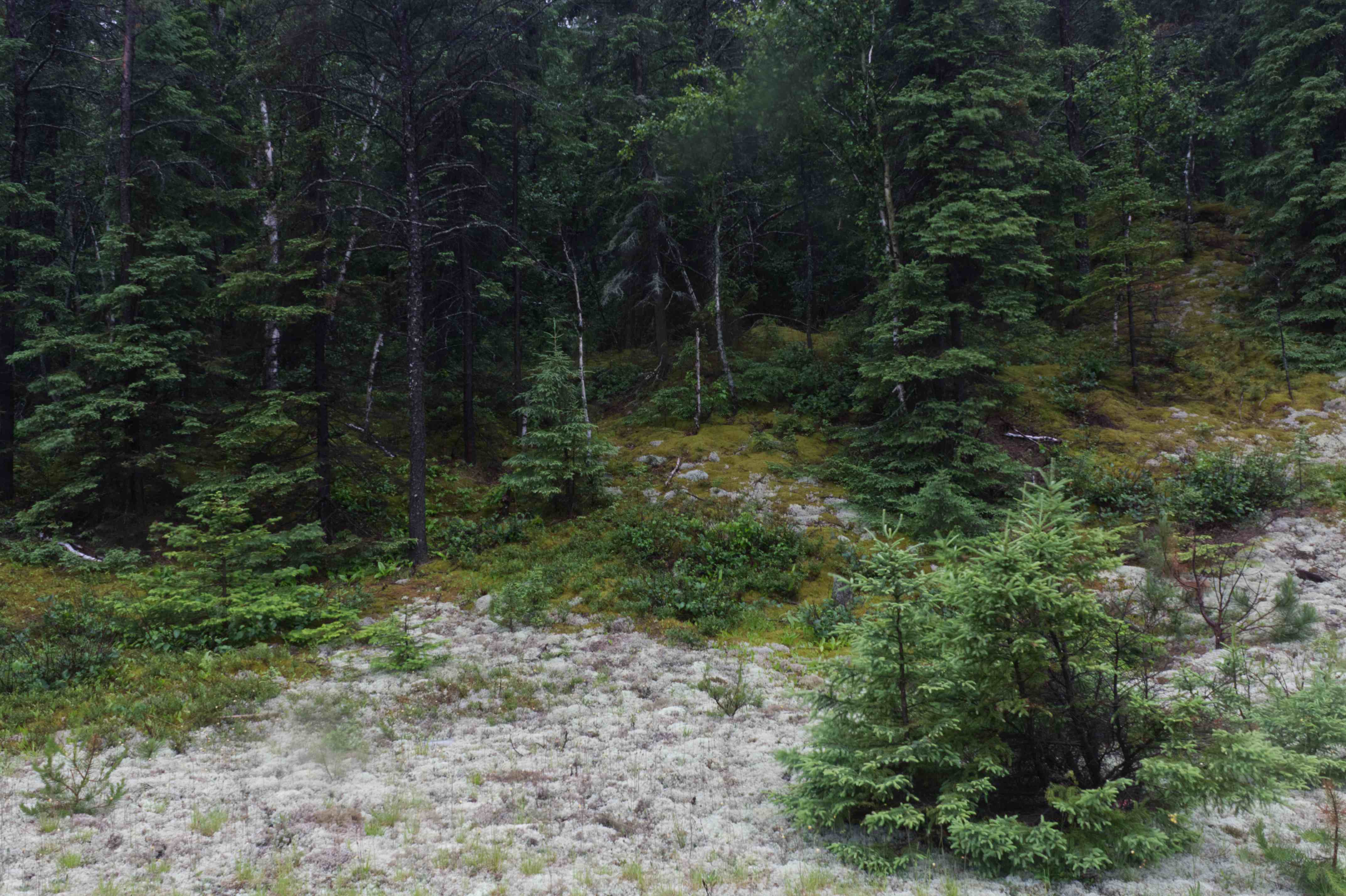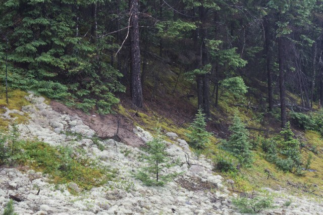 When the rain abated to a steady sprinkle, I ventured out to photograph the spruce-moss-lichen forest by the side of the road. I stood in the drizzle and set up my tripod and camera to take my shots, careful not to tread on the reindeer lichen. Reindeer lichen is highly susceptible to trampling. Branches break off easily and they take decades to recover. This fruticose lichen is a key food source for reindeer and caribou during the winter; it also helps stabilize soil and recycles nutrients.