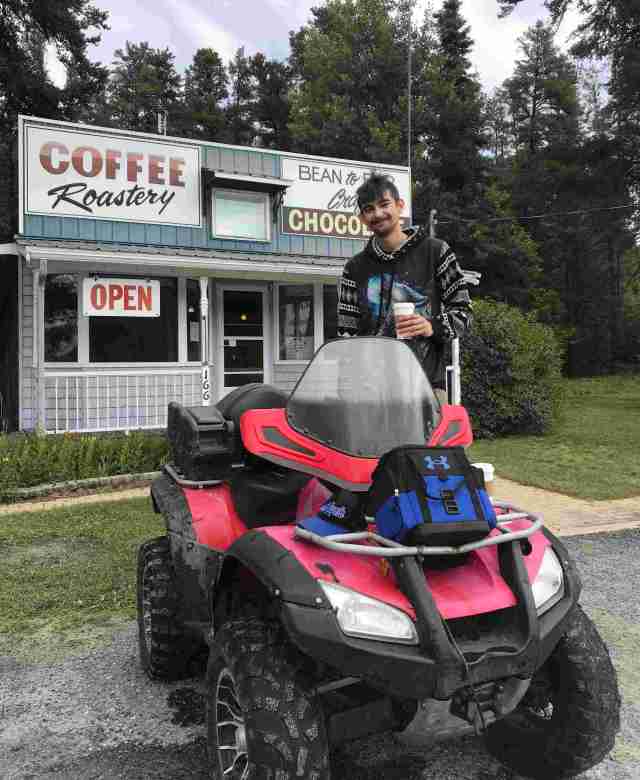 Coffee in hand, Simon stands next to his ATV with cooler, ready to return to ‘the bush’ (photo by Nina Munteanu)