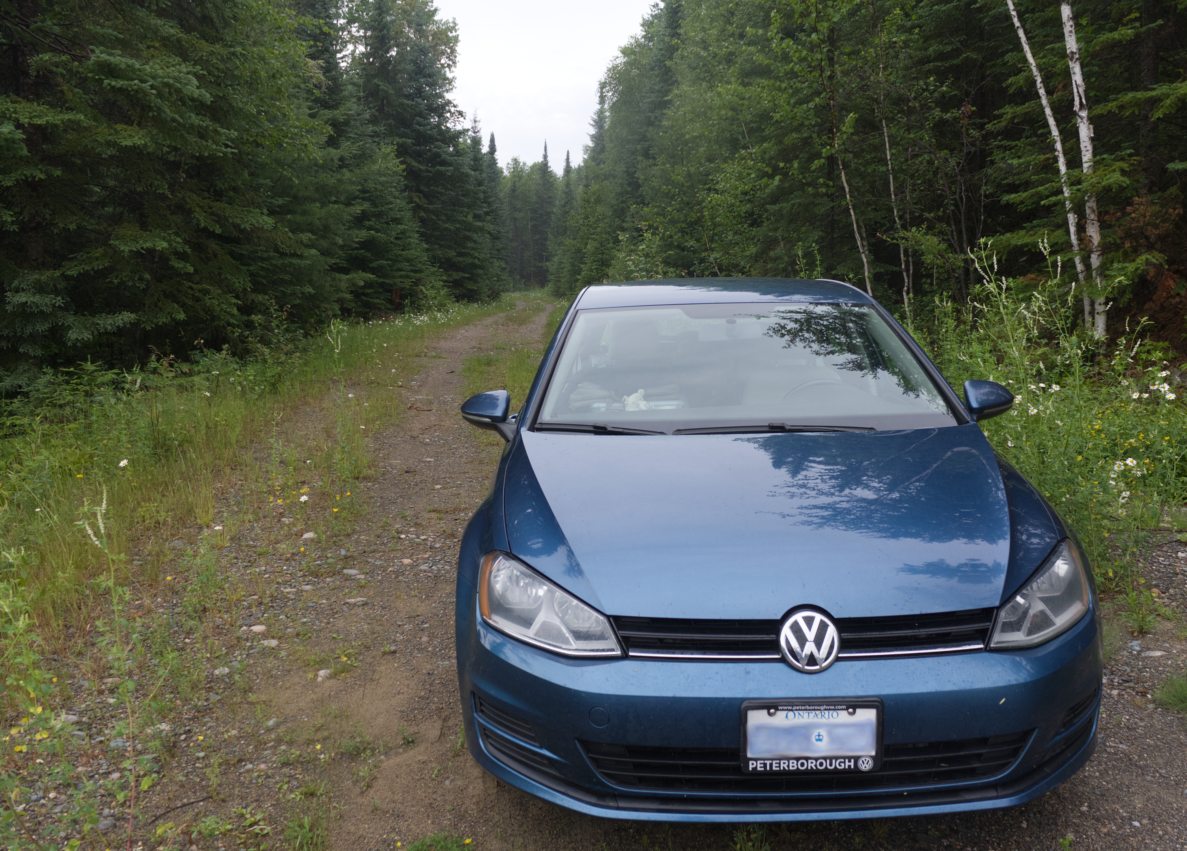 I stopped at English River overnight and the following morning woke to the echoing calls of two loons on the lake. I left at dawn with a peach sky behind me and a dark charcoal sky ahead of me. Soon the dark clouds unburdened themselves and the rain fell in a deluge as I continued west, barely making out the road and dense forest through flapping windshield wipers. The forest here was a mix of balsam fir, white and black spruce, white pine, aspen and white birch.