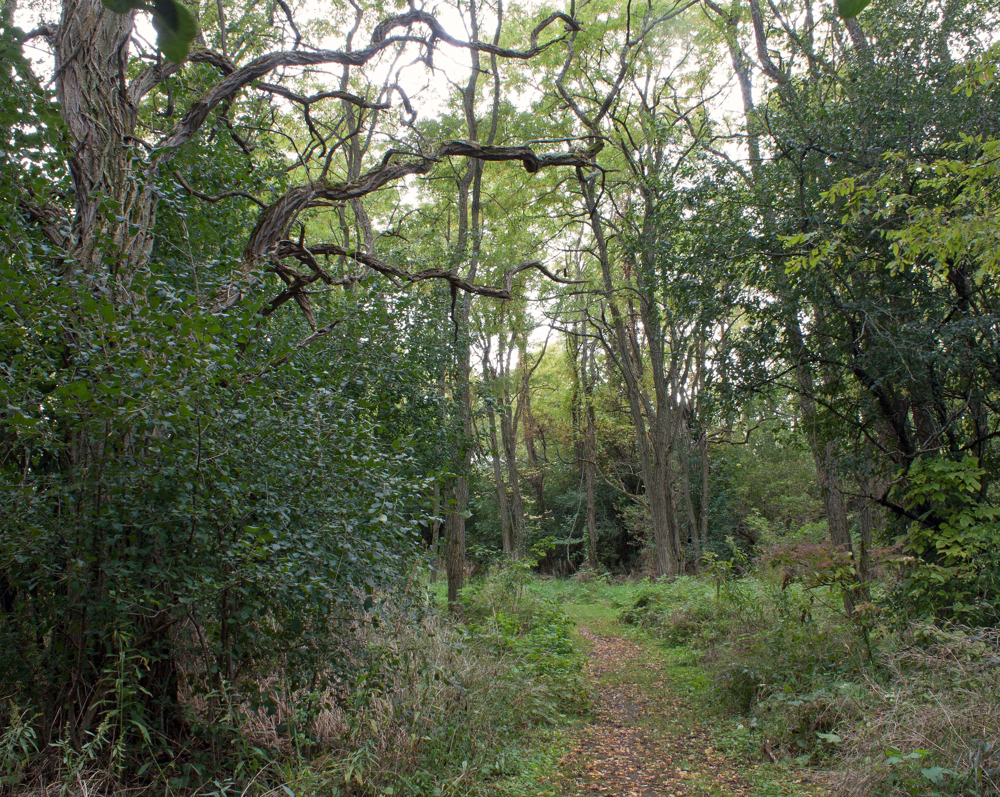 Gnarly branches of black Locust tree arc over the trail, Trent Forest, ON (photo by Nina Munteanu)