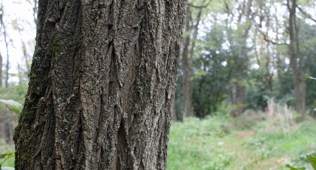 Deeply furrowed trunk of black locust on trail through black locust grove, Trent Forest, ON (photo by Nina Munteanu)