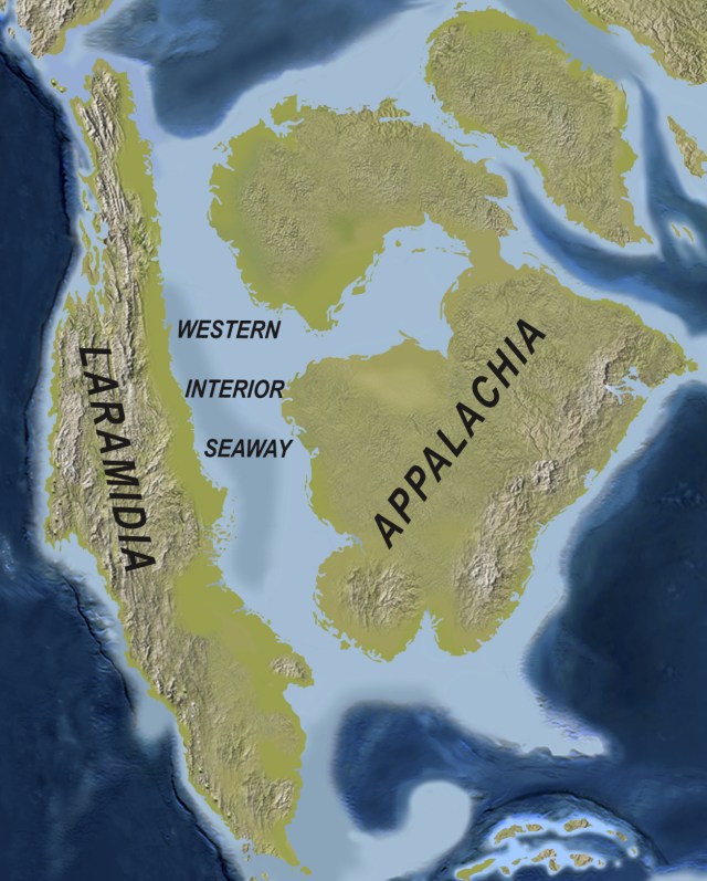 Called the Western Interior Seaway, this Cretaceous inland sea stretched from the Arctic Ocean down to the Gulf of Mexico, connecting the two oceans and separating the continent into eastern (Appalachia) and western (Laramidia) landmasses and covering what is now most of Manitoba, Saskatchewan and part of Alberta. Existing from about 100 to 66 million years ago, this shallow marine sea supported a rich and diverse marine life, including the shell-crushing durophagous Ptychodus mortoni, apparently 10 metres long. I thought all this as I raced across a giant dry ocean of grass waving in the wind. I imagined myself a crab scuttling along the ocean floor beneath 760 m of water as giant sharks, 13-metre long mosasaurs and other exotic creatures swam leisurely above me. Is that why I found myself speeding along the highway and crossing into Saskatchewan before I knew it?