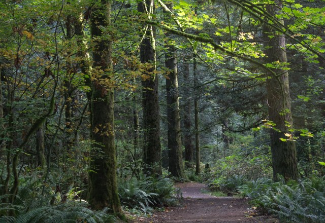 Sun-streaked Douglas fir forest, Watershed Park, BC (photo by Nina Munteanu)