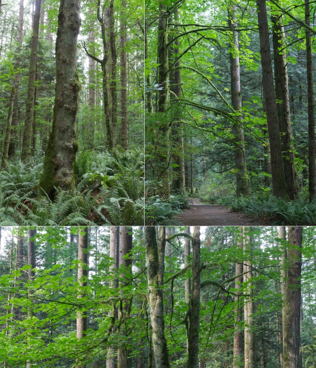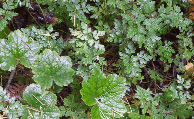 Aside from the Douglas fir-dominated tree-scape and associated understory, the main difference between this raincoast forest and the old-growth forests I’ve encountered in Ontario (e.g. eastern hemlock-eastern cedar-sugar maple-hophornbeam), was the plethora of ferns and mosses—not only on the ground and rocks, but on the trees and ‘dripping’ off the branches; lending credence to the term ‘rainforest.’ Other common underbrush included Oregon grape (Berberis aquifolium) and huckleberry (Vaccinium parvifolium). Other ground cover included Herb Robert (Geranium robertianum), trailing blackberry (Rubus ursinus), wild gooseberry (Ribes uva-crispa) and several others.