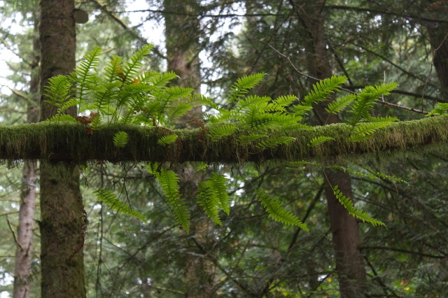 The forest floor of Watershed Park was a verdant blanket of ferns: mostly Western sword fern (Polystichum munitum), deer fern (Blechnum spicant), lady fern (Athyrium filix-femina) and western bracken fern (Pteridium aquilinum). I found Licorice fern (Polypodium glycyrrhiza), mostly as an epiphyte on the big leaf maple trunks and branches, keeping company with thick carpets of various mosses.