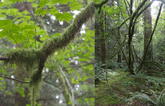 I encountered many vine maples, their beautiful tender green leaves adding a living froth of green to the forest. These understory shade-tolerant trees are native to the moist forests of the Pacific Northwest. The vine maple thrives in moist, nitrogen-rich soils, often forming dense thickets. I found Cat-tail moss streaming down their slender trunks and draped down like green waterfalls from every branch and twig.