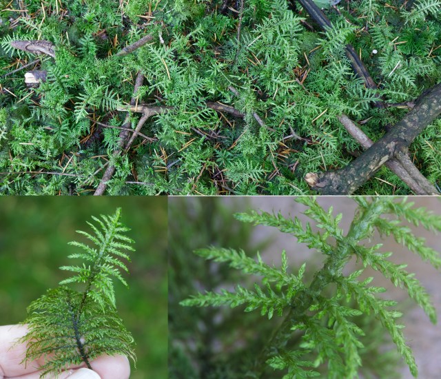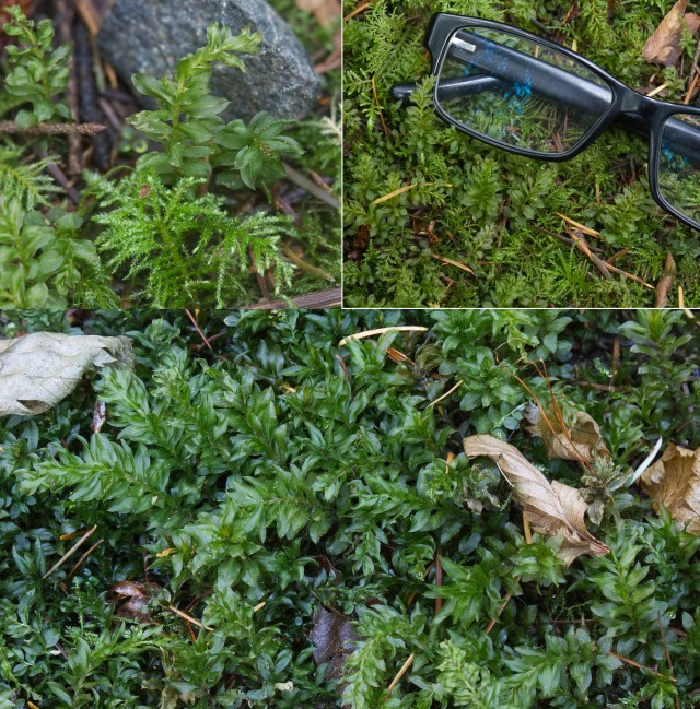 The forest floor—from ground to fallen logs and branches—was densely covered in a thick brilliant green carpet of mostly mountain fern moss (Hylocomium splendens). Hylocomium splendens is also called step moss, given how it forms its new growth each year in step-fashion from a bend in the previous frond. The yearly growths of this moss together resemble an undulating tiny forest of miniature ferns and, like Sphagnum, form a spongy multi-layered mat.