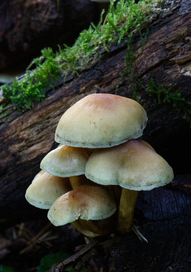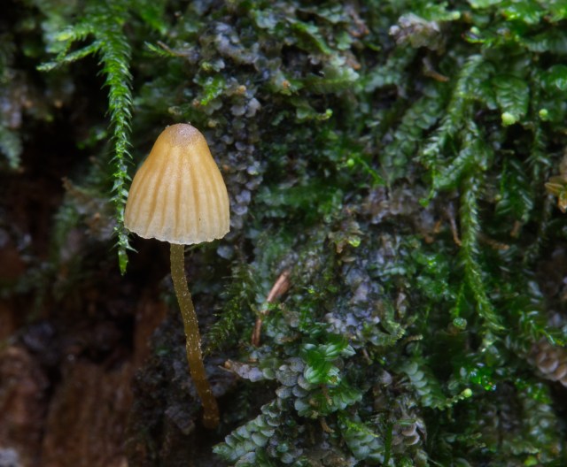 Growing down the horizontal face of the mossy stump were several orange waxcap (Hygrocybe) mushrooms and mostly on the top of the stump several tiny brown-grey striped mushrooms about 5 mm tall, which I identified as Clustered Bonnet (Mycena inclinata).