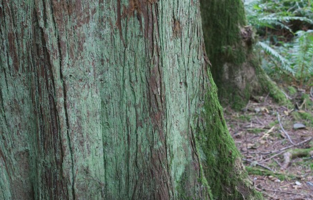 Each tree supported a unique ecosystem for mosses, lichens and liverworts. This makes sense, given the unique texture and chemistry (such as nutrient availability and pH) of a tree’s bark. For instance, the red alder, which is often found in verges where sunlight is plentiful and whose neutral to acidic bark tends to remain smooth—even in older trees—harbours a uniquely rich set of lichen and mosses, not seen on other trees. The deeply furrowed acidic bark of Douglas fir supported a distinctly different community.