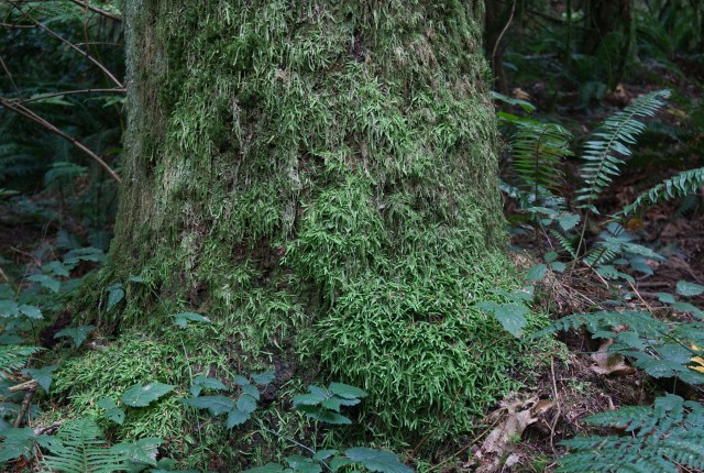 Along the tree trunk I saw strings of Cat-tail moss (Isothecium stoloniferum) and puffy bright green tufts of curly mountain fork moss (Dicranum montanum).