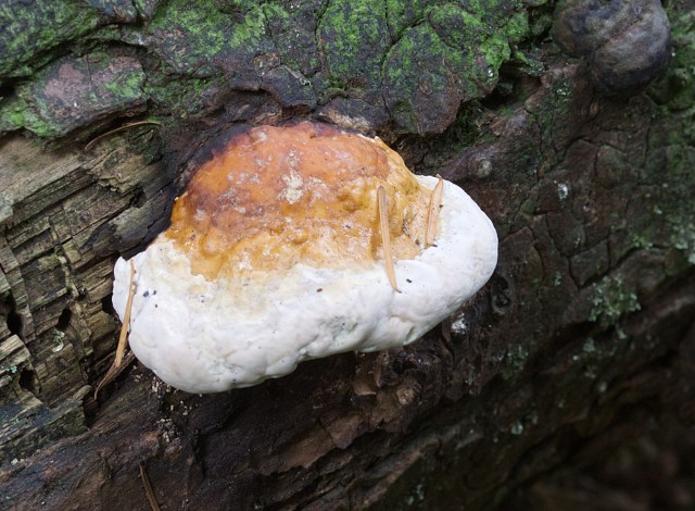 Many of the Douglas fir trees were hosts to various polypores. Gonoderma oregonense, the Western Varnish Conk or westcoast reishi on several Douglas fir trees and hemlocks. Known to colonize Douglas firs, this bracket fungus causes root and butt white rot; I spotted it mostly on snags and downed trees. Another white polypore seemed more common on live trees.