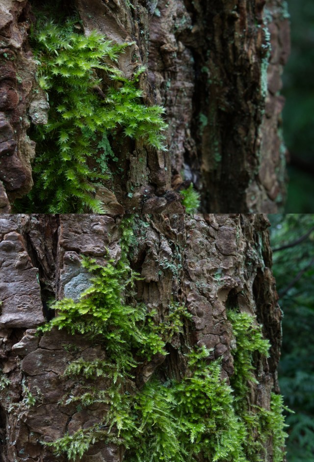 Two views of Rhytidiadelphus triquetrus moss on a Douglas fir, Watershed Park, BC (photo by Nina Munteanu)