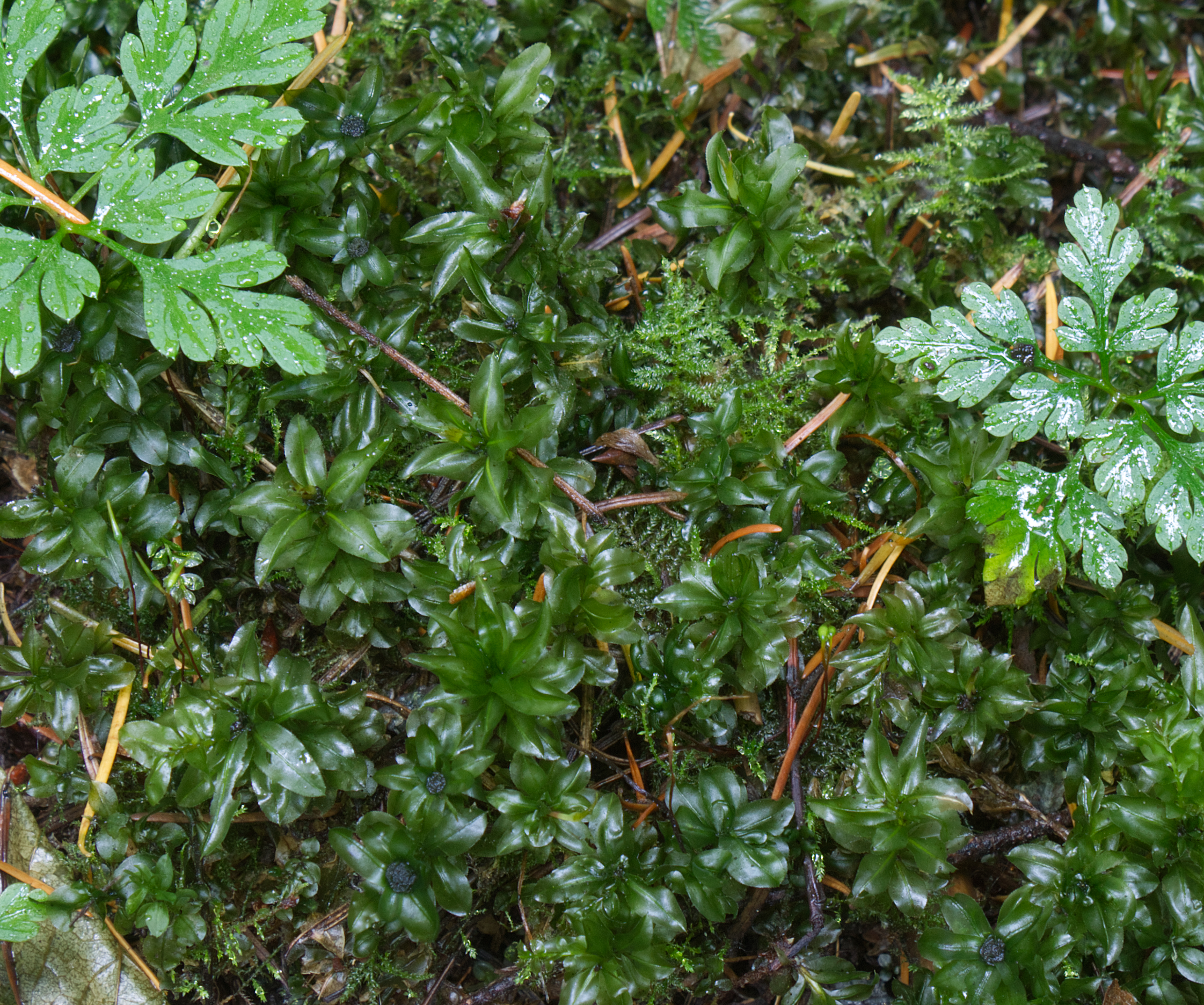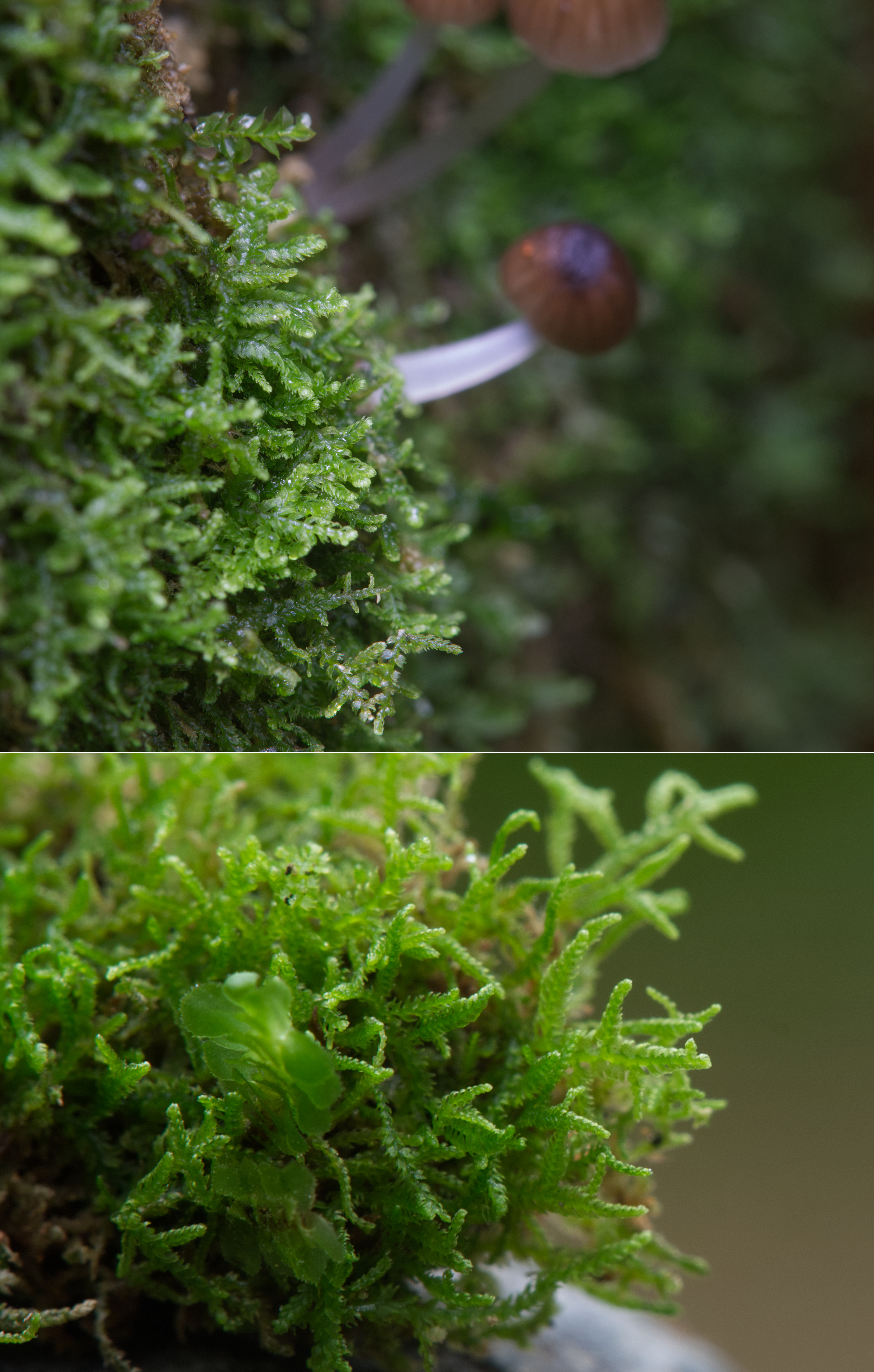 The liverwort Cephalozia lunulifolia (renamed Fuscocephaloziopsis lunulifolia) was growing like lace amid Plagiothecium curvifolium (see image above; look for more translucent fronds with lunar-looking leaves). Also known as moon-leaved liverwort, Cephalozia is a slender bryophyte, less than 1 mm across, with incurved pincer-like or moon-shaped leaves. It likes moist environments and prefers rotting logs, peaty banks or moist humus-rich soils.