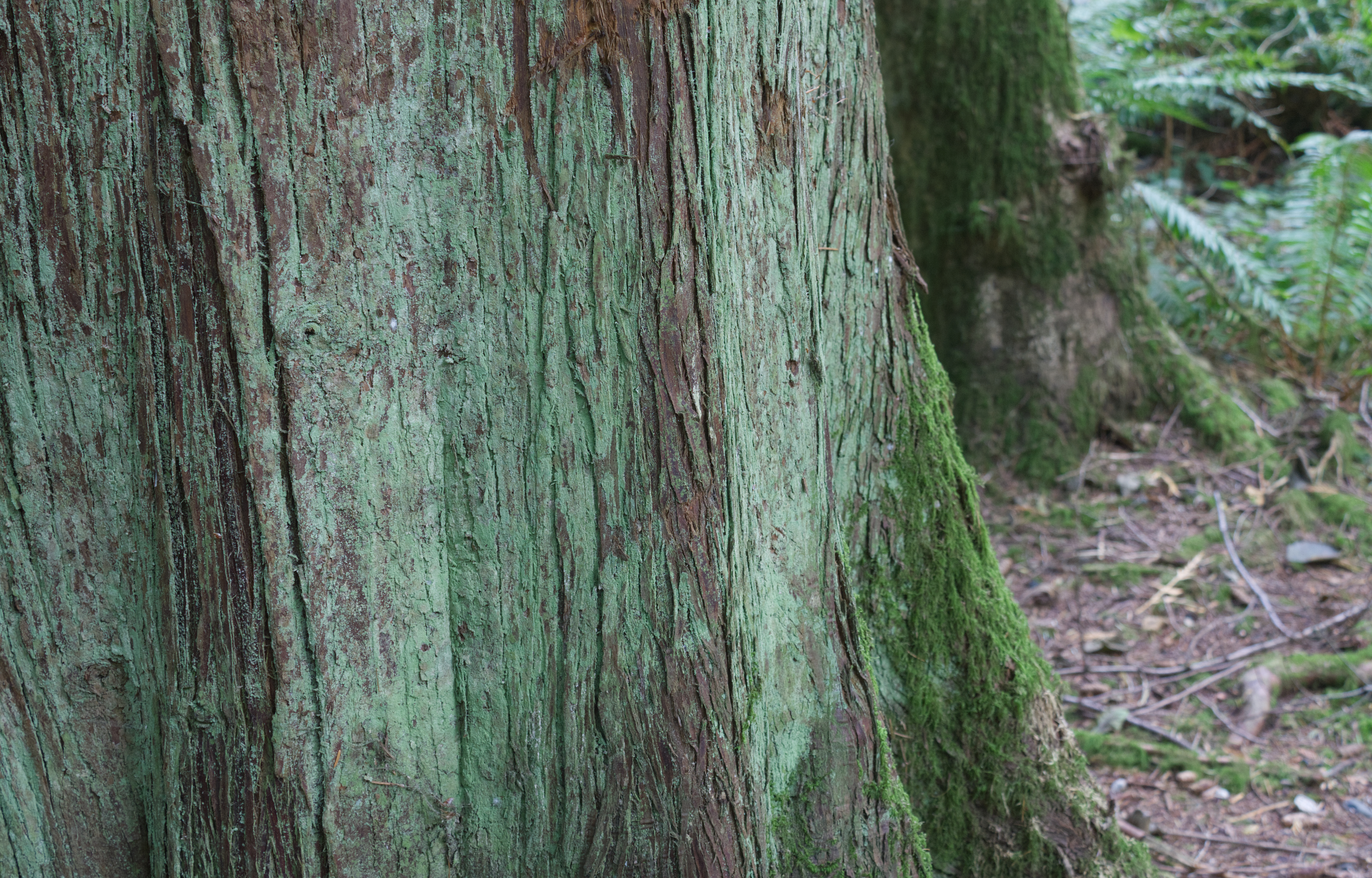 Each tree supported a unique ecosystem for mosses, lichens and liverworts. This makes sense, given the unique texture and chemistry (such as nutrient availability and pH) of a tree’s bark. For instance, the red alder, which is often found in verges where sunlight is plentiful and whose neutral to acidic bark tends to remain smooth—even in older trees—harbours a uniquely rich set of lichen and mosses, not seen on other trees. The deeply furrowed acidic bark of Douglas fir supported a distinctly different community.