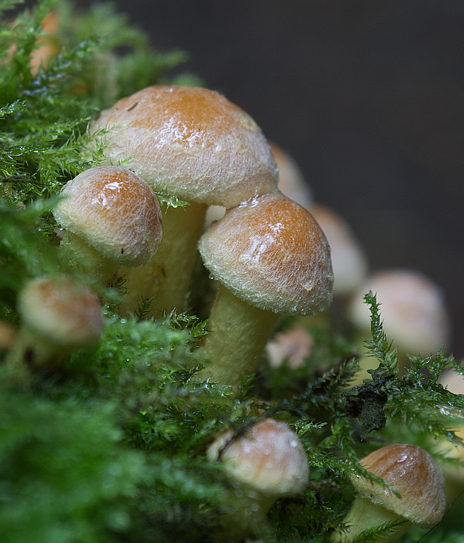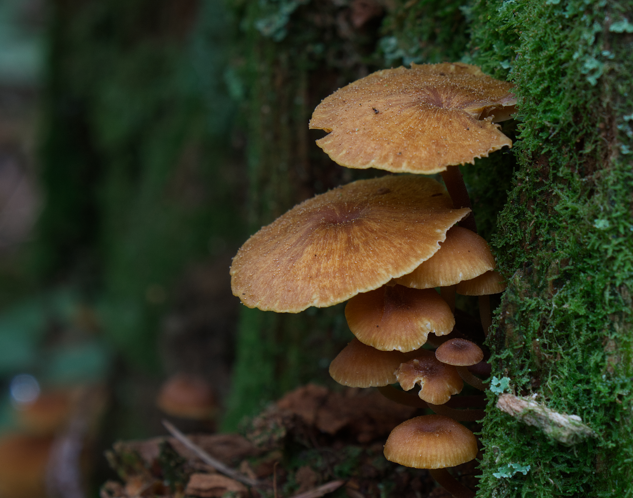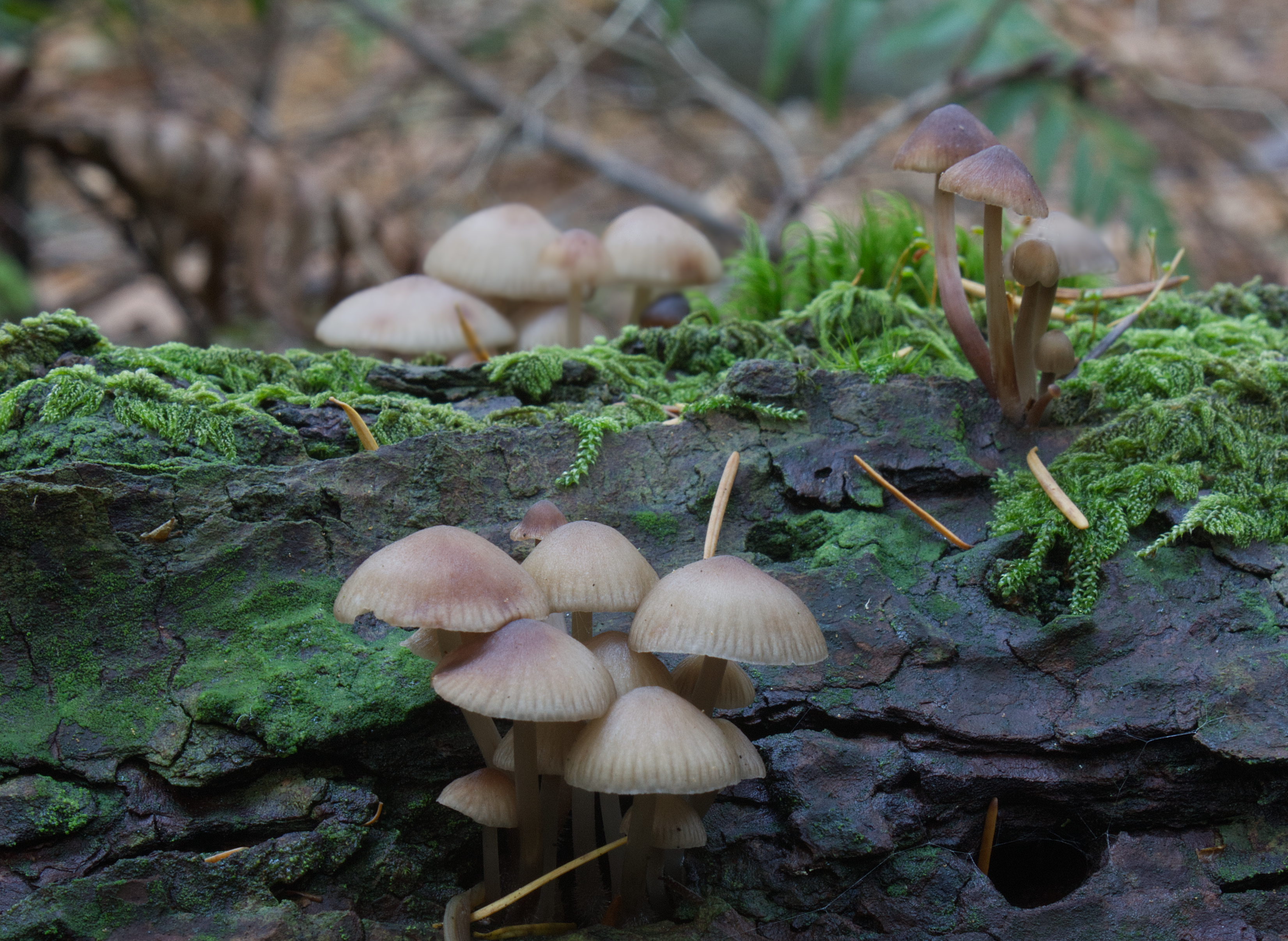 Growing down the horizontal face of the mossy stump were several orange waxcap (Hygrocybe) mushrooms and mostly on the top of the stump several tiny brown-grey striped mushrooms about 5 mm tall, which I identified as Clustered Bonnet (Mycena inclinata).