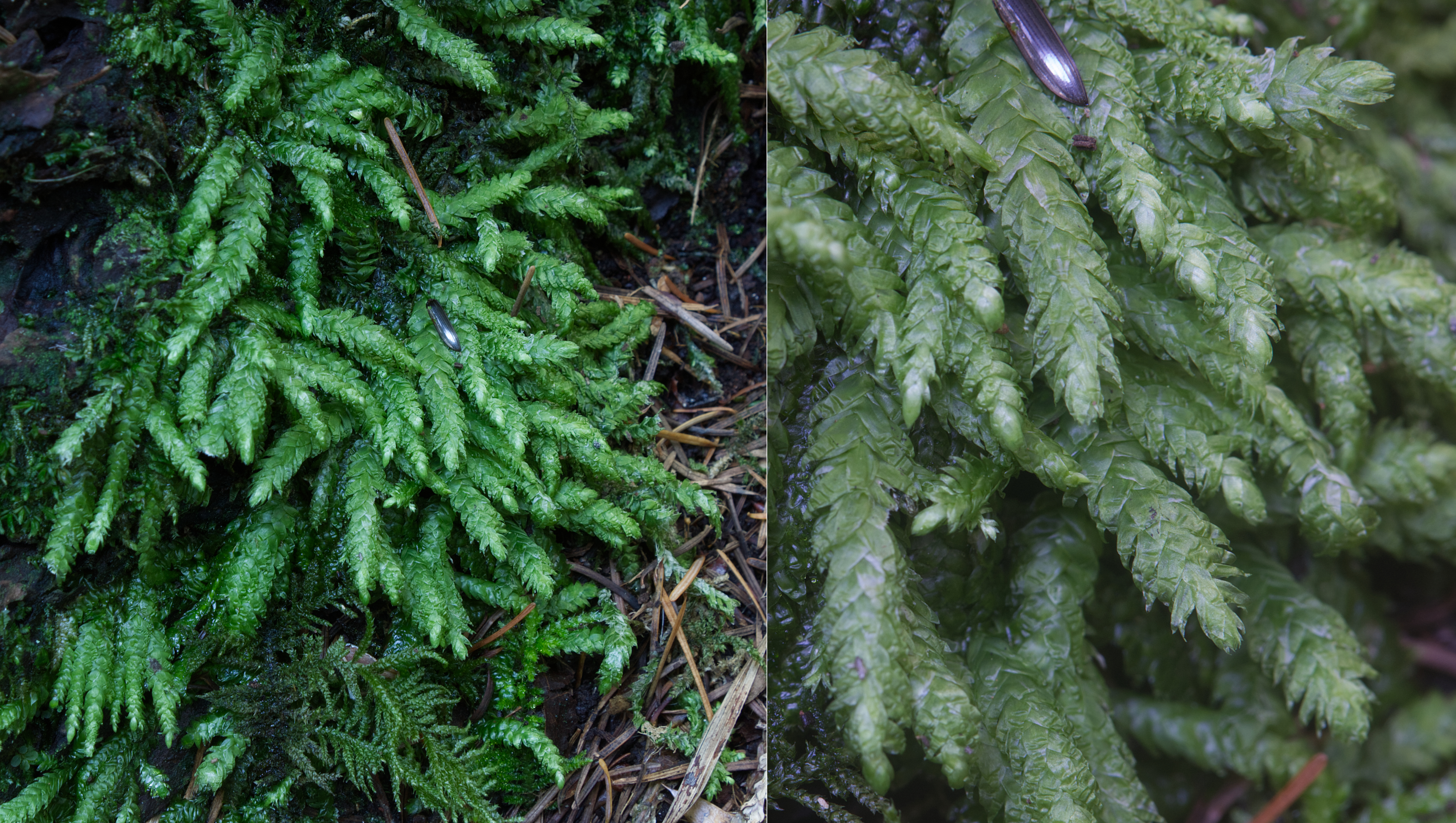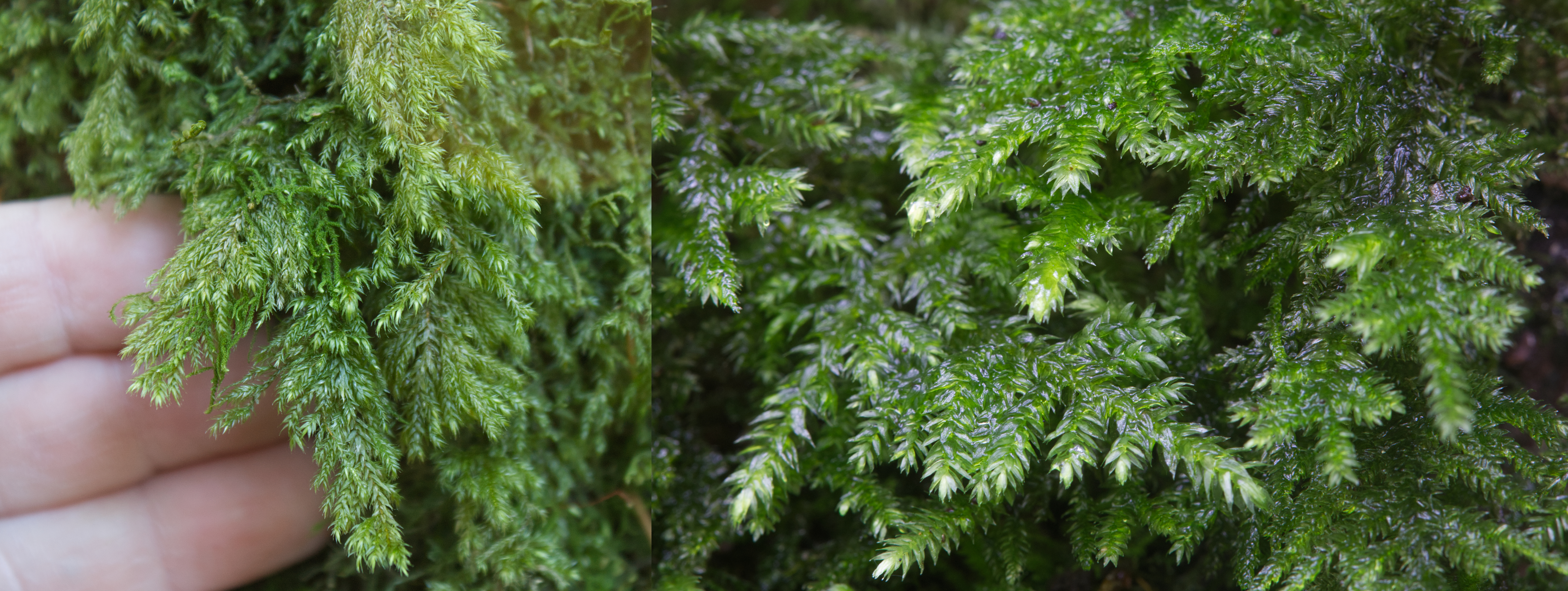 Two views of Rhytidiadelphus triquetrus moss on a Douglas fir, Watershed Park, BC (photo by Nina Munteanu)