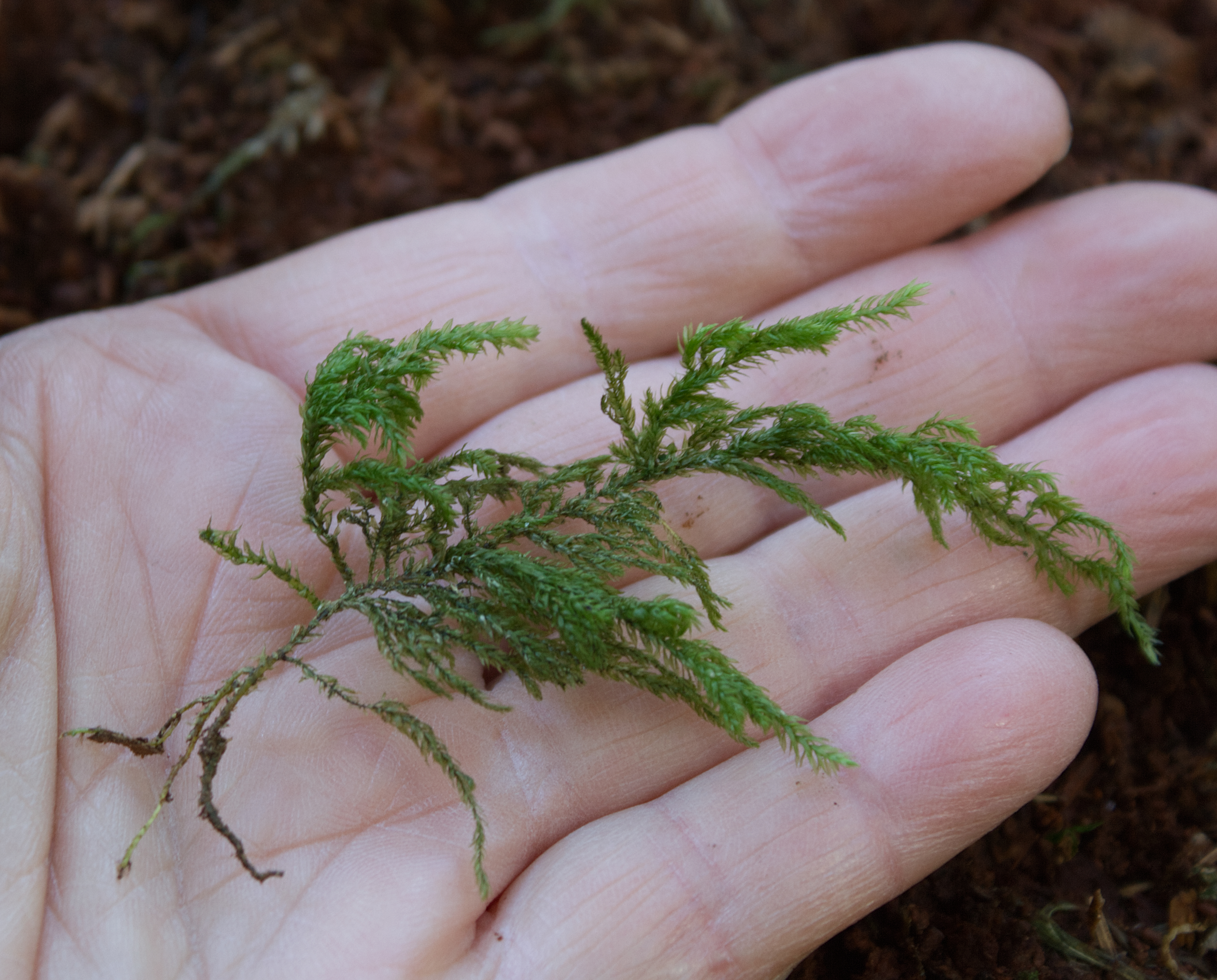 The forest floor—from ground to fallen logs and branches—was densely covered in a thick brilliant green carpet of mostly mountain fern moss (Hylocomium splendens). Hylocomium splendens is also called step moss, given how it forms its new growth each year in step-fashion from a bend in the previous frond. The yearly growths of this moss together resemble an undulating tiny forest of miniature ferns and, like Sphagnum, form a spongy multi-layered mat.