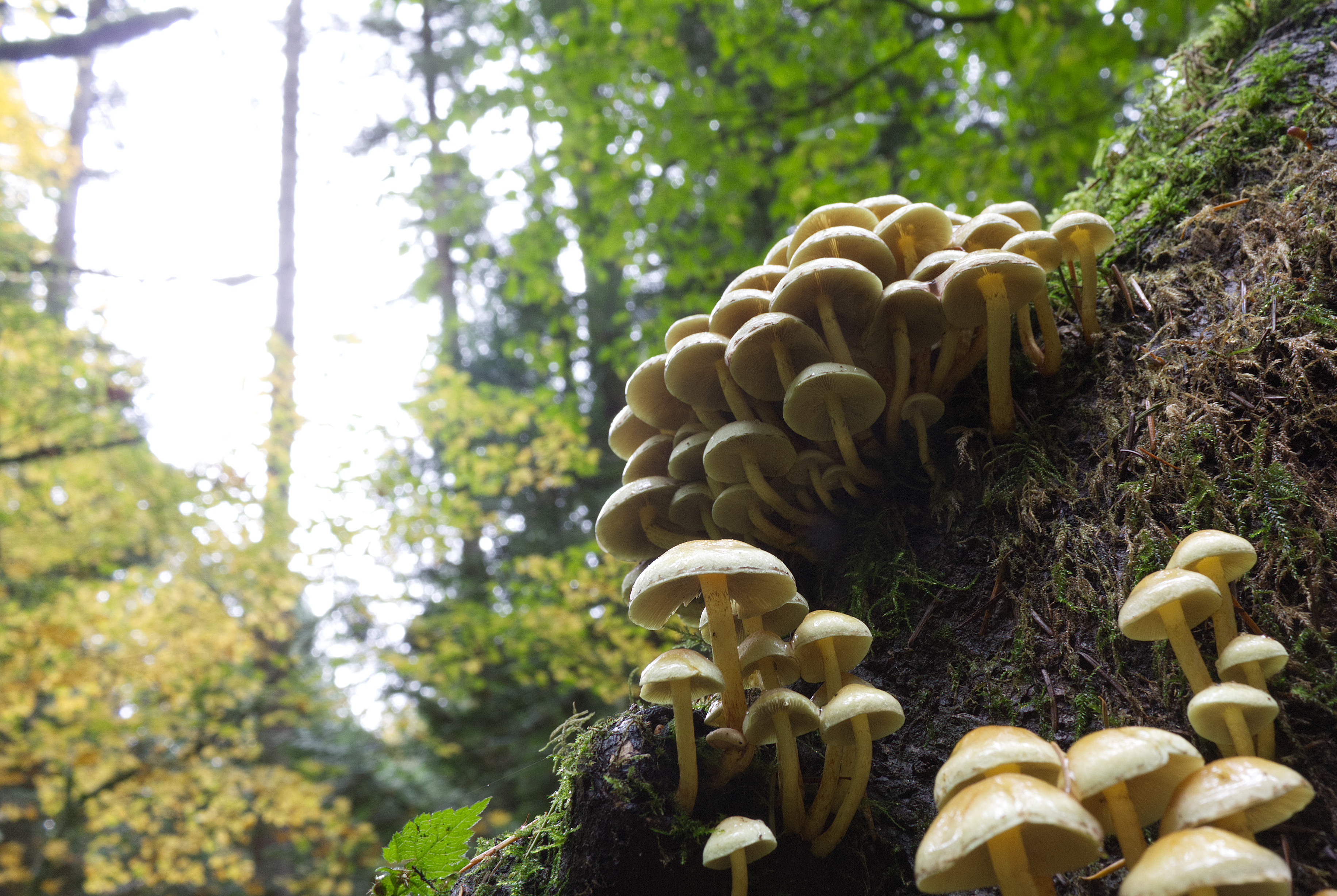This led me to another search and I came across the very common (some even call it invasive) Honey Mushroom (Armirallia sp.). Armirallia lives on dead and live wood of conifer and hardwood trees, often seen in dense clusters—as I did—on dead logs, stumps, and roots. They are found throughout British Columbia, in forests along the coast. Depending on where it is growing, Armirallia shifts between being a saprophytic decomposer on dead wood (breaking down dead plant and animal matter and returning essential nutrients to the soil) to a parasitic pathogen causing root or butt rot in living trees. This is also the case for many fungi; for example Kretzschmaria deusta, the Brittle Cinder Fungus, and Coprinellus domesticus, the endophytic inkcap. The relationship of the endophytic fungus with its host tree works on a continuum, potentially switching from mutualism to antagonism depending on environmental pressures; the endophyte becomes saprobic once the host starts dying, helping to decompose it and eventually returning nutrients back to the soil. These fungi demonstrate a versatile lifestyle by shifting from one role to another depending on the changing conditions.