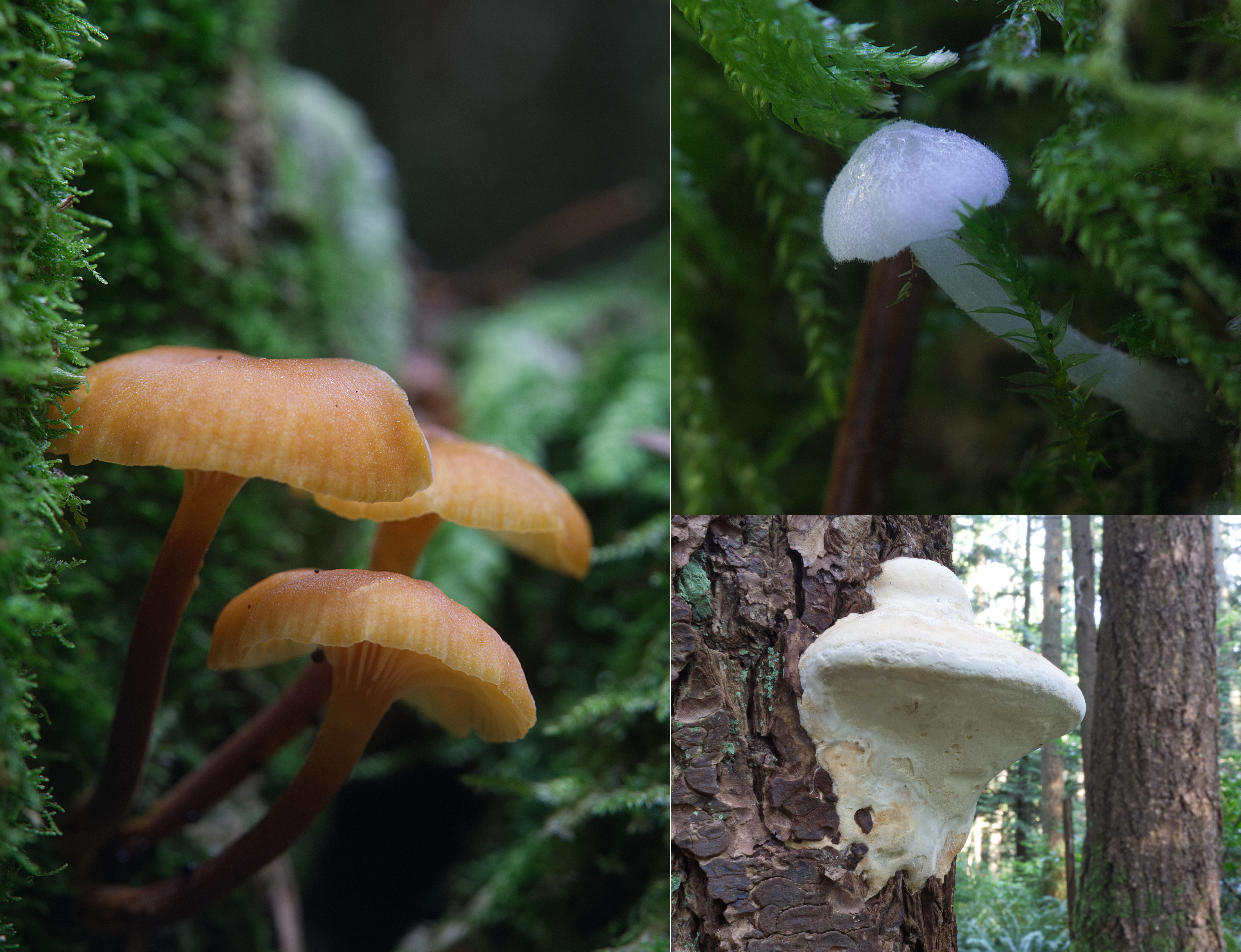 Many of the Douglas fir trees were hosts to various polypores. Gonoderma oregonense, the Western Varnish Conk or westcoast reishi on several Douglas fir trees and hemlocks. Known to colonize Douglas firs, this bracket fungus causes root and butt white rot; I spotted it mostly on snags and downed trees. Another white polypore seemed more common on live trees.