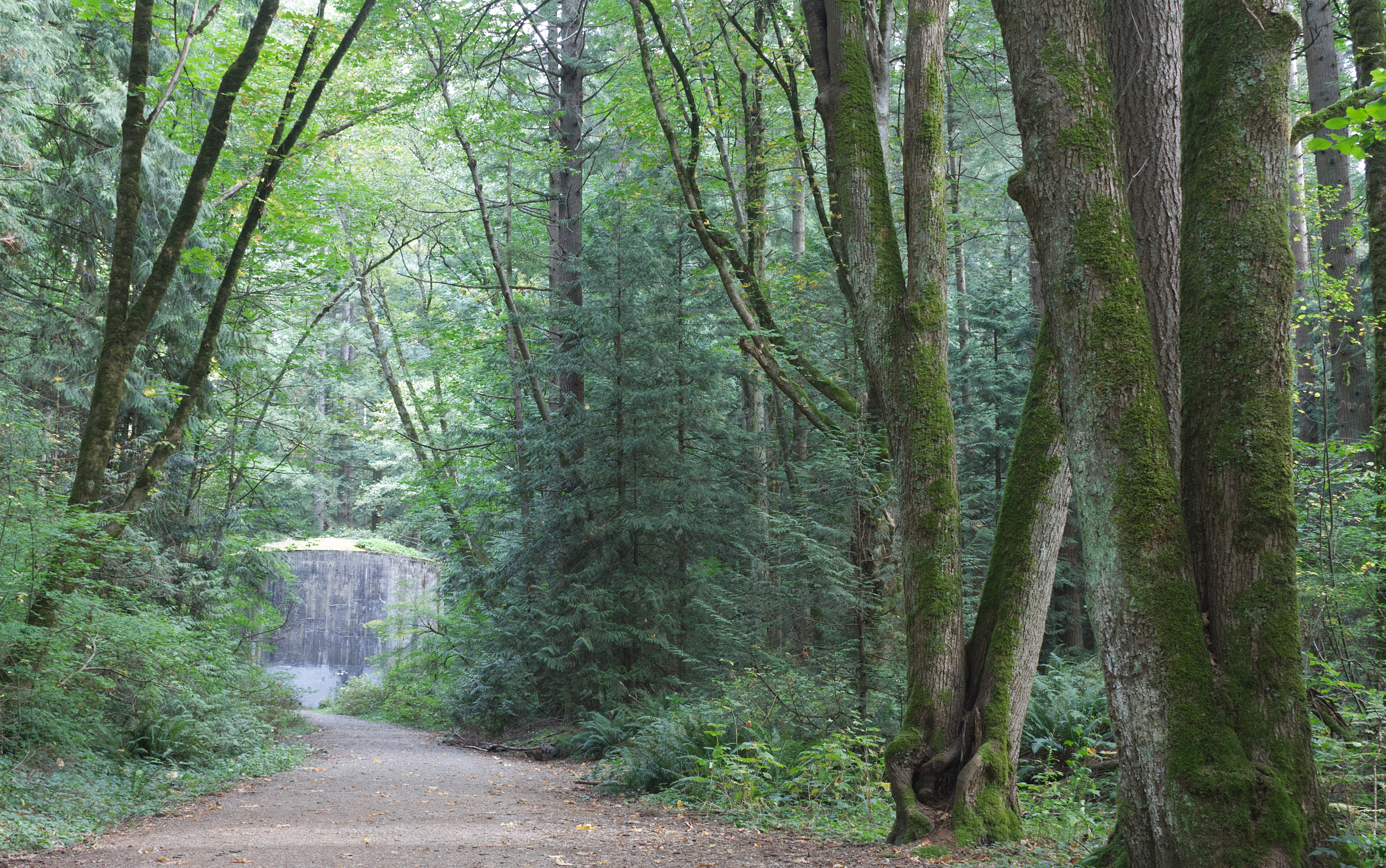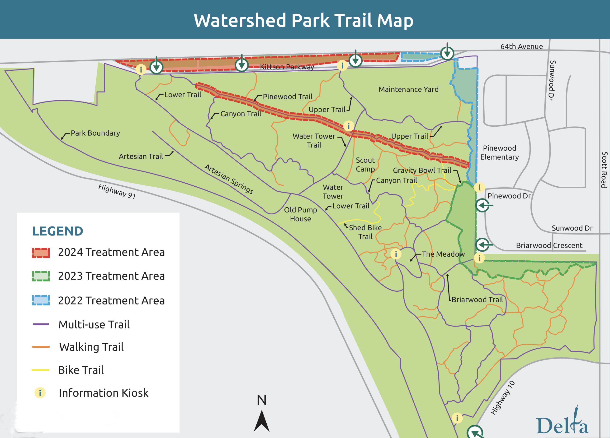 Watershed Park is about 153+ hectares in size and riddled with 11 km of trails for cycling and hiking. It is protected from logging, even as it is bordered by commercial, residential and industrial sites, with Highways 10, 91 and Scott Road running along its perimeters.