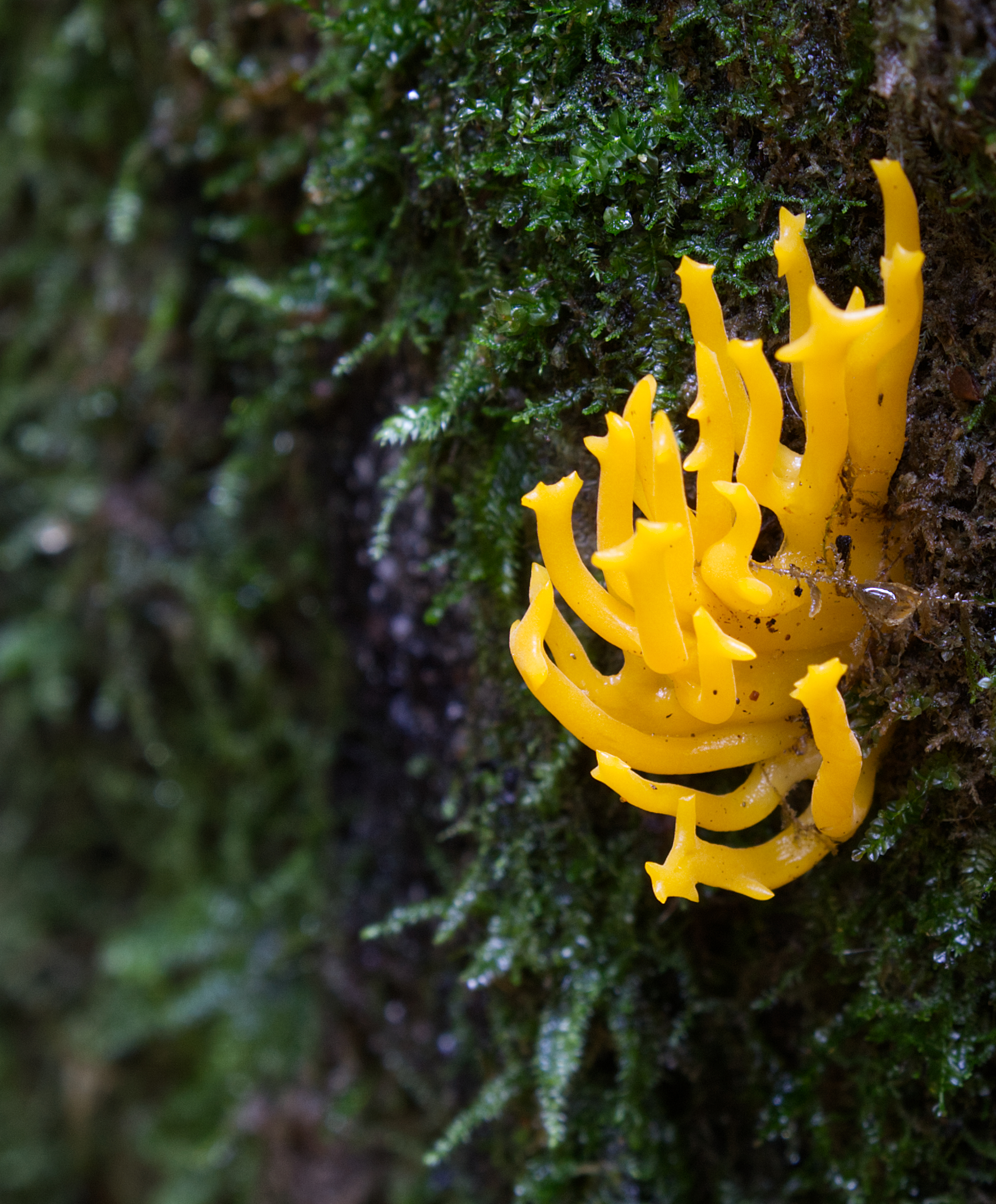 I found the jelly fungus Yellow Stagshorn (Calocera viscosa) on decaying logs and ground litter throughout the forest. Like most jelly fungi Calocera viscosa grows on wood, but the wood is usually moss-covered and often buried, so that the mushrooms appear terrestrial. More orange than yellow, this wood-rotting fungus with antler-like branches grows up to 10 cm high.