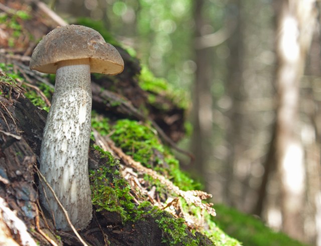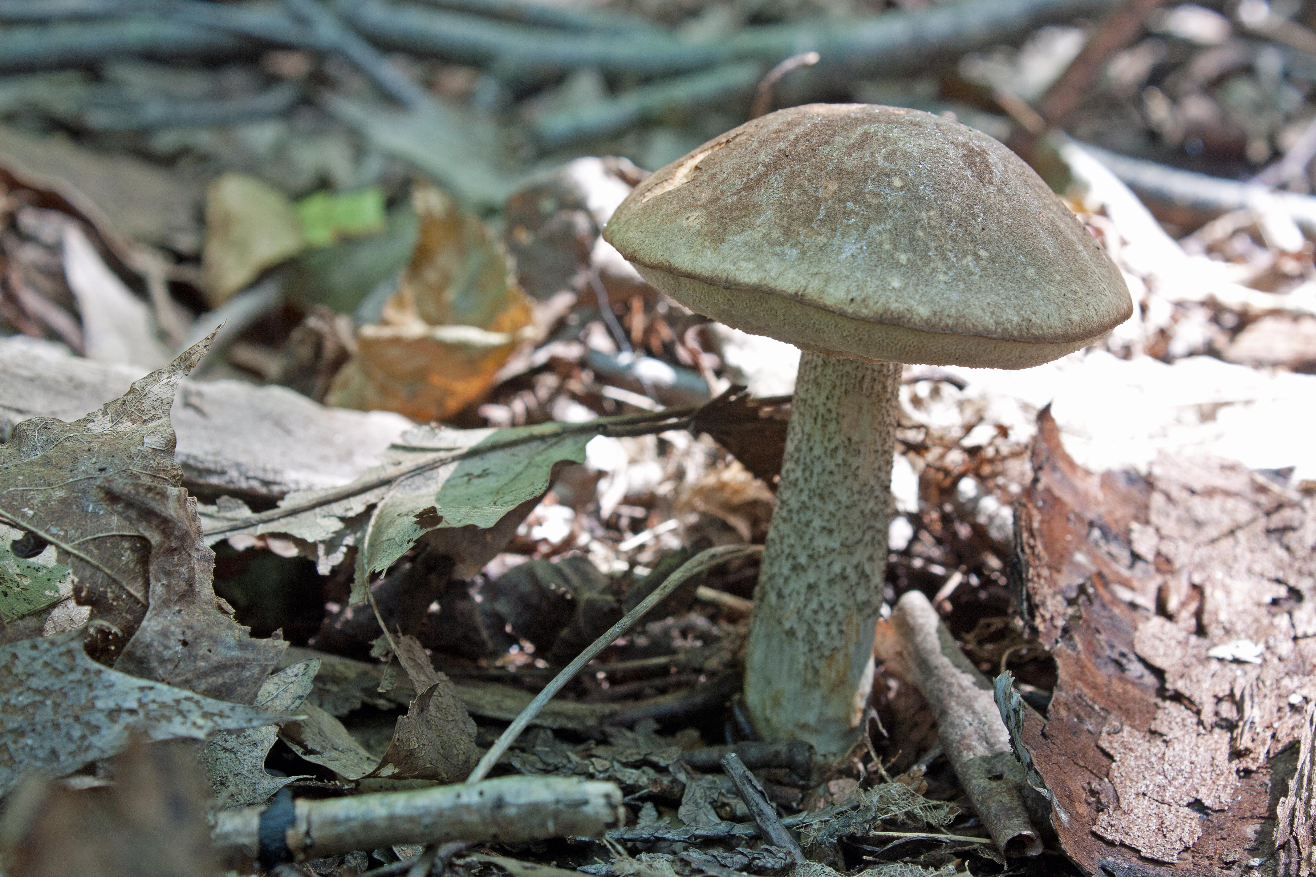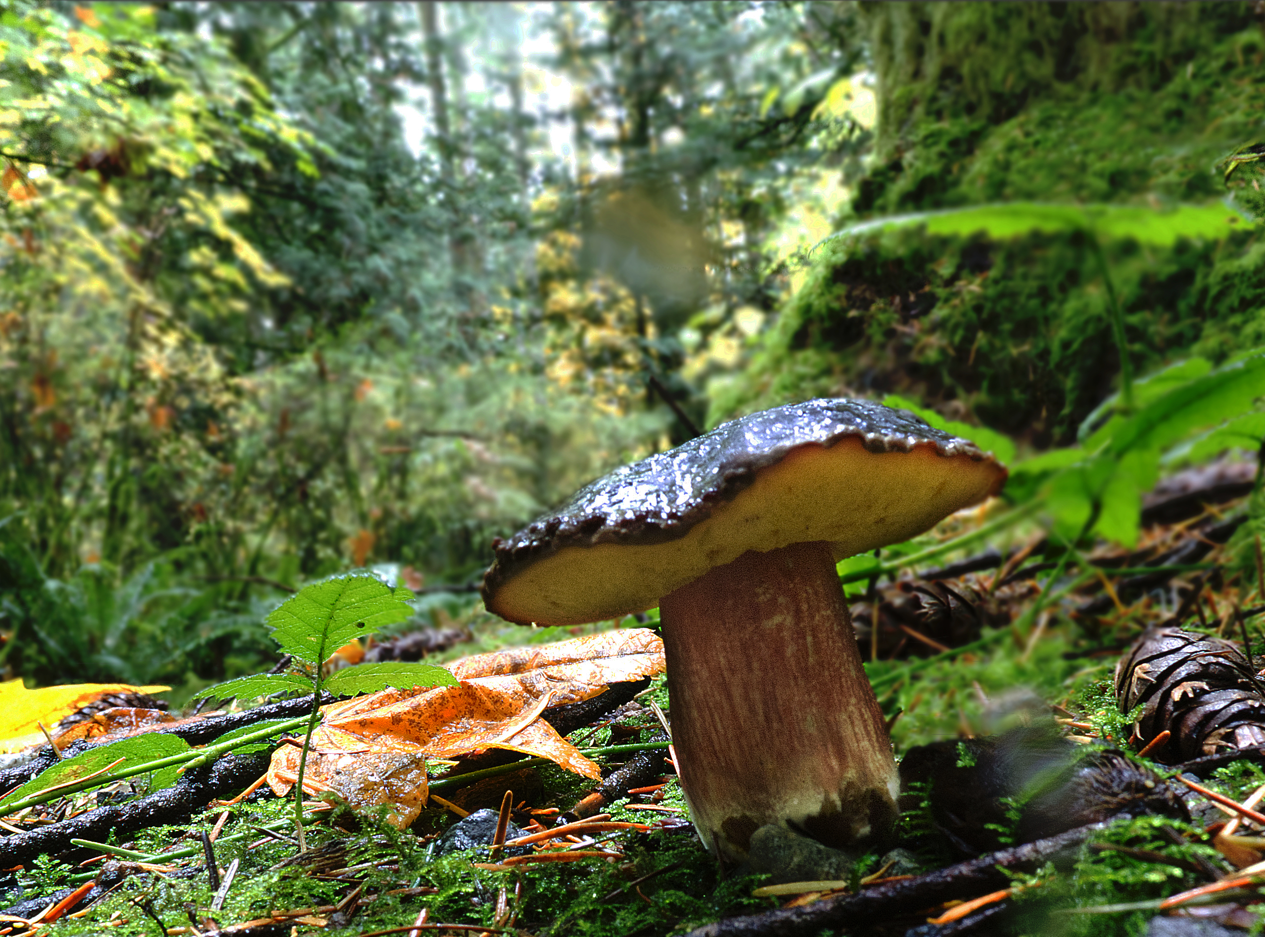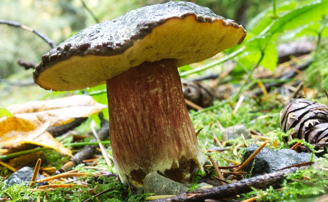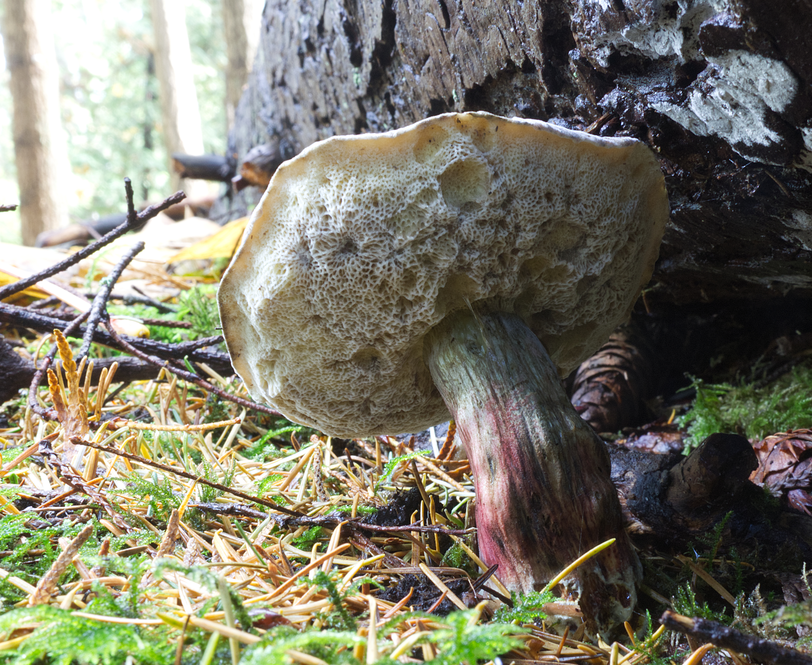 During my walks in Watershed Park’s Douglas fir forest in the fall, I noticed among the many sprouting fall mushrooms, a rather sizable mushroom with dark gray cap that resembled a stone or pebble (see my other article on Tricholoma terreum). Like Tricholoma, the dark ‘stone-looking’ cap made this mushroom difficult to find—except for one thing: I caught a glimpse of its bright reddish stem, hiding unsuccessfully amid the step moss. Intrigued, I looked more closely and noticed that this mushroom was a bolete.