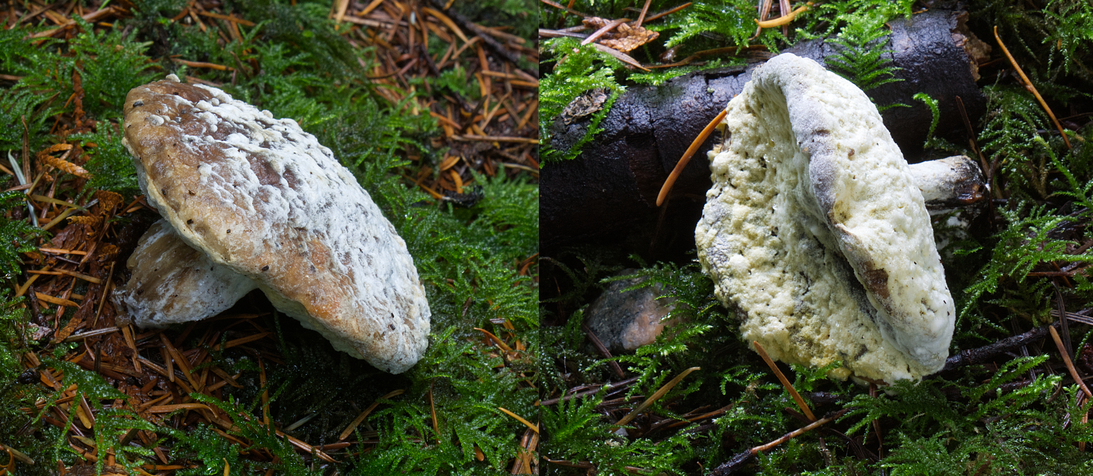 Post Script: By late November, many of the boletes in the Douglas fir forest of Watershed Park, BC, were covered in a white mold, Bolete Eater Mold (Hypomyces chrysospermus), which, as the name implies, primarily attacks the fruiting bodies of boletes, especially in their final stages of decay.
