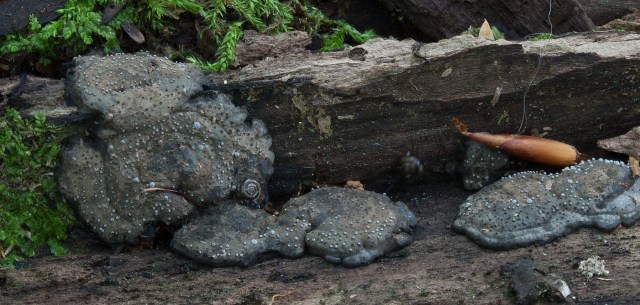 After identifying the saprobic jelly fungus Exidia nigricans spreading on a rotting beech log, I noticed the bluish mycoparastic fungus Heteromycophaga glandulosae forming little bumps or warts on the jelly fungus’s hardening grey surface. This rare parasite is usually reported parasitizing Exidia glandulosa (Black Witch’s Butter) but also parasitizes Exidia nigricans.