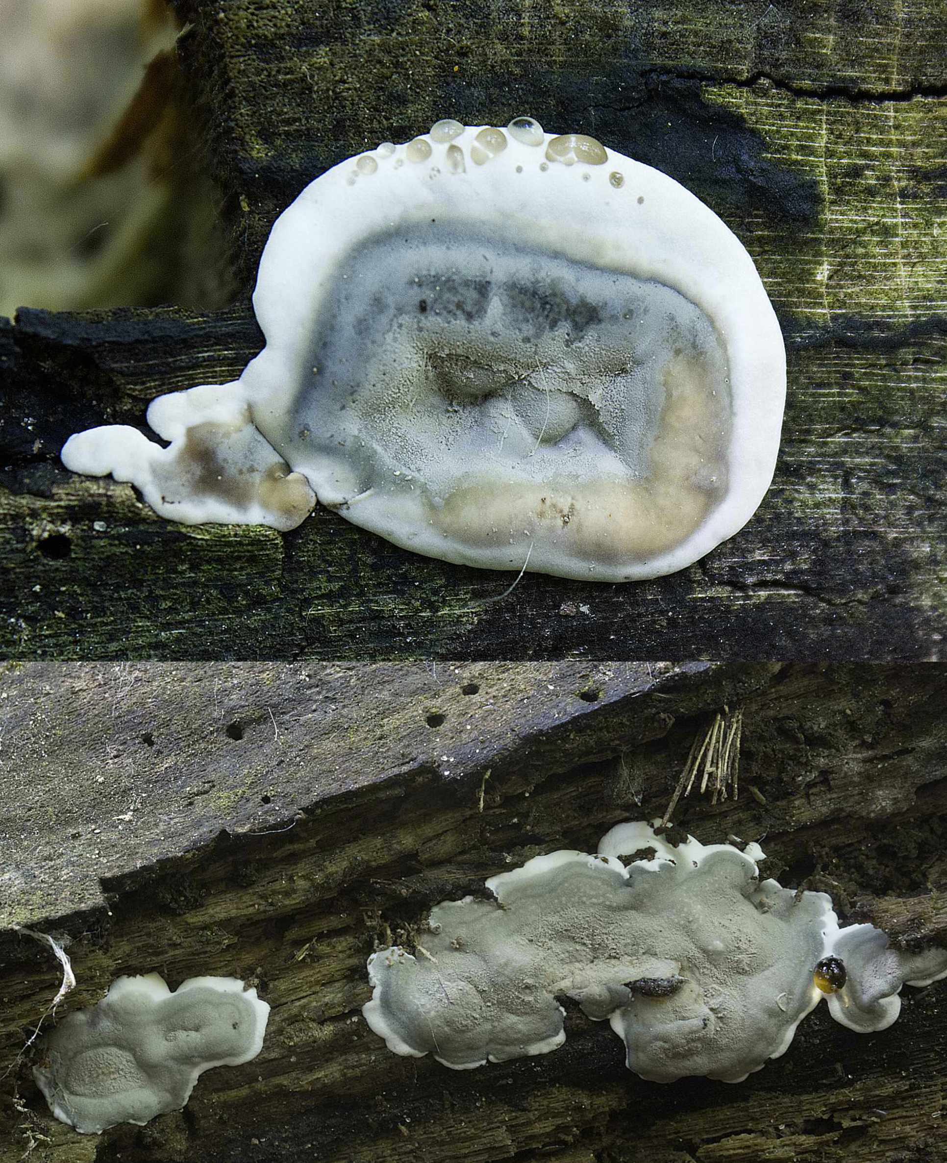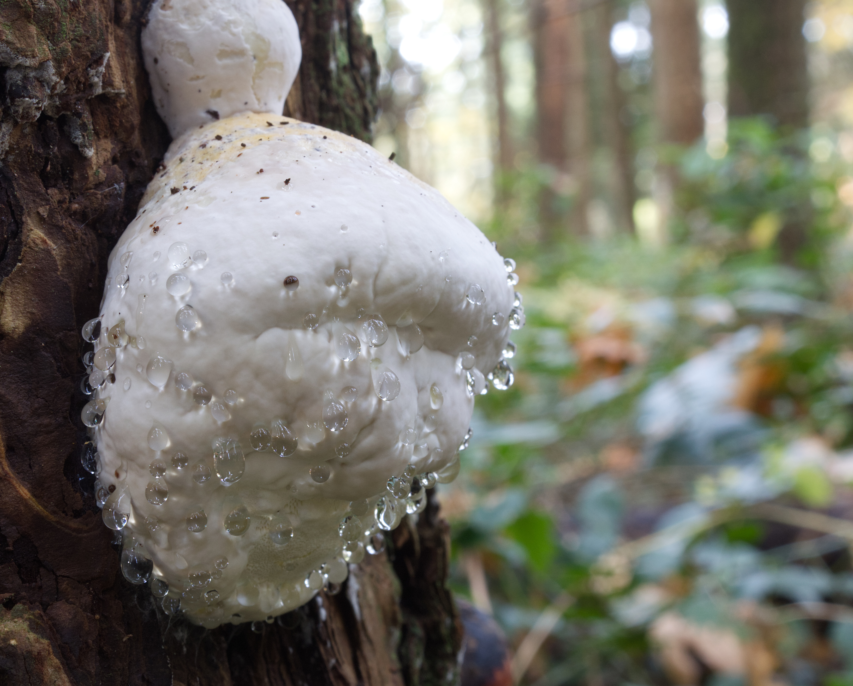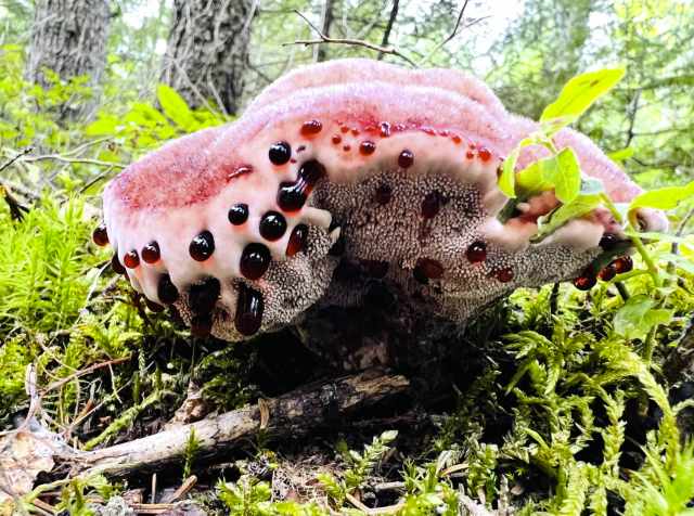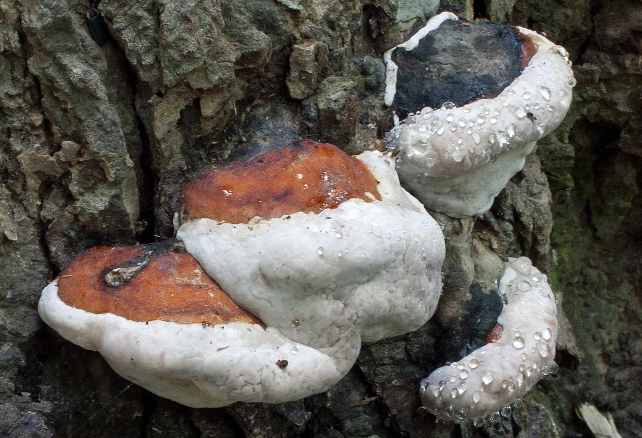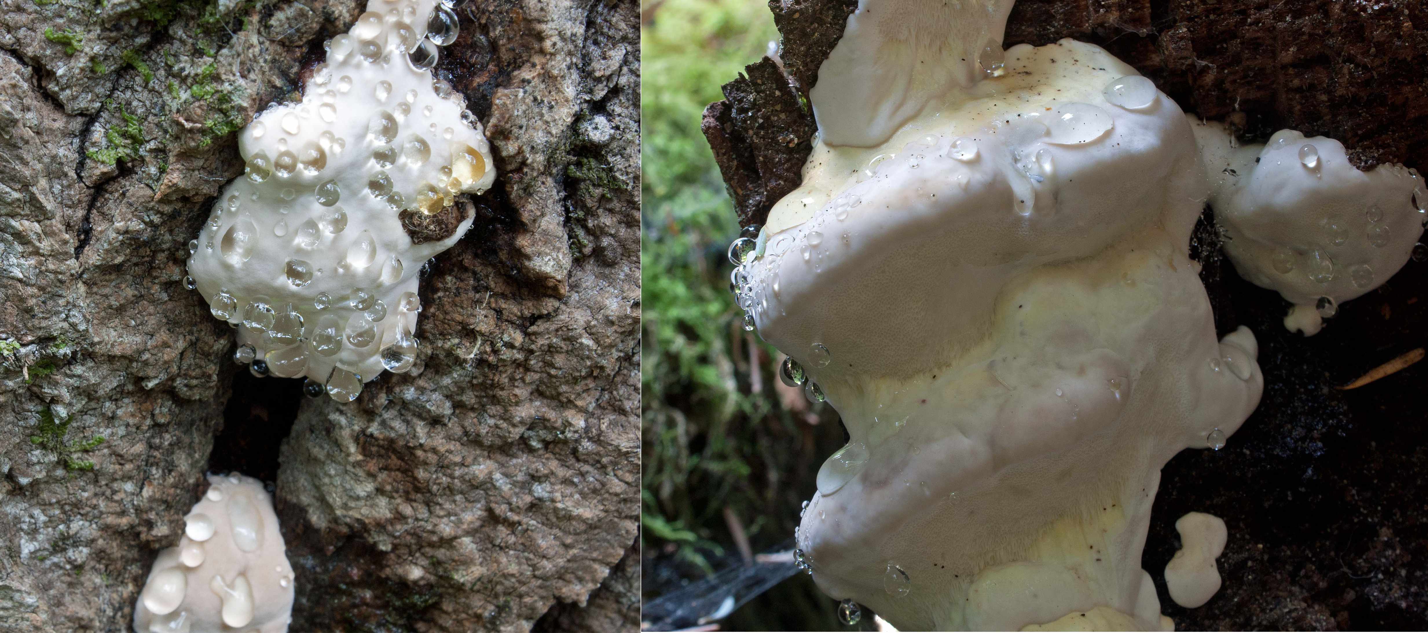My first introduction to this oozing phenomenon was on a rusty-white bracket fungus on a maple tree in an Ontario forest: Fomitopsis pinicola, a stem-decay polypore known as Red-Belted Conk. The exuded clear droplets of a young conk sparkled in the sun like jewels. I’ve read that Fomitopsis pinicola is one of the most damaging decay fungi in old-growth forests. It can cause heart rot in living trees but is mostly observed decomposing the wood of trees already killed by other pathogens.