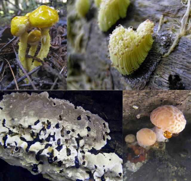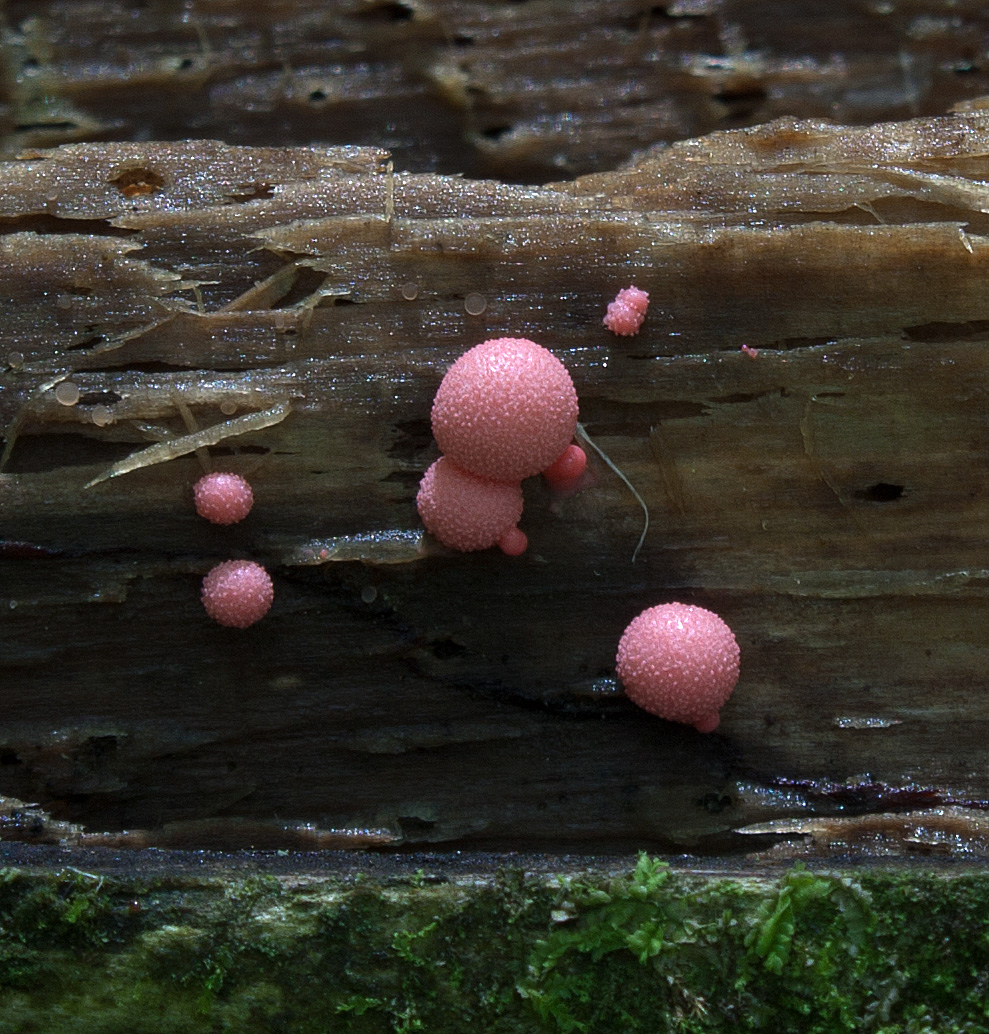 In several other forests in Ontario, I saw the slime mold known as Wolf’s Milk (Lycogala epidendrum) colonizing rotting cedar logs and resembling a pink or grey puffball. Their colour varies quite a bit, ranging from orange or pink and reddish to grey to yellowish brown or greenish black; they often start out pinkish orange and become grey-ocher as they mature. I saw round and somewhat compressed balls, some with distinct warts. When immature they are filled with a pink, paste-like fluid that spills out when popped; as they age, the paste becomes powdery.