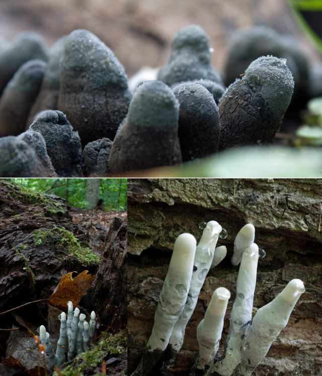 I also saw several colonies of Deadman’s Fingers (Xylaria polymorpha) in the same Ontario old-growth forest amid fallen maple trees and on decaying logs. Fingers emerged through the cracks in the rotting bark and some were undergoing guttation, clear drops forming on the ‘finger tips’. This saprotrophic fungus grows on dead woods of various hardwood trees, preferably beech, where I had found it before. But this time it was a maple tree. Xylaria polymorpha is a wood-rotting fungus that consumes the polysaccharides such as glucan that bind the cellulose and lignin to form wood. What remains is a nutrient-rich soft mess that insects and other creatures feed on.