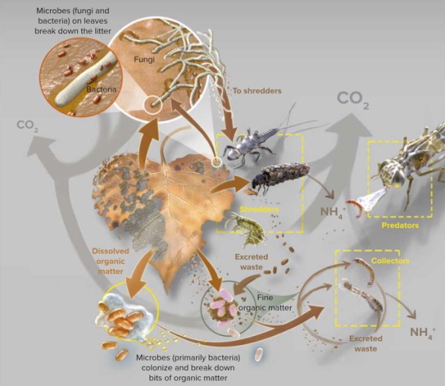 According to leaf litter biologist Jane Marks, biologist at Northern Arizona University, dead leaves provide a primary food base for life up the food chain, from fungi and bacteria that initially colonize the leaves, and the insects that chew them, up to the birds and fish that eat the insects. This creates a “brown” food web more expansive than the “green” food web the leaves nourish when they are still alive, writes Marks. This brown food web—based on dead organic matter or detritus—involves the repackaging of energy that supports many life forms and several trophic levels in a healthy ecosystem and is often the dominant energy pathway in that ecosystem.