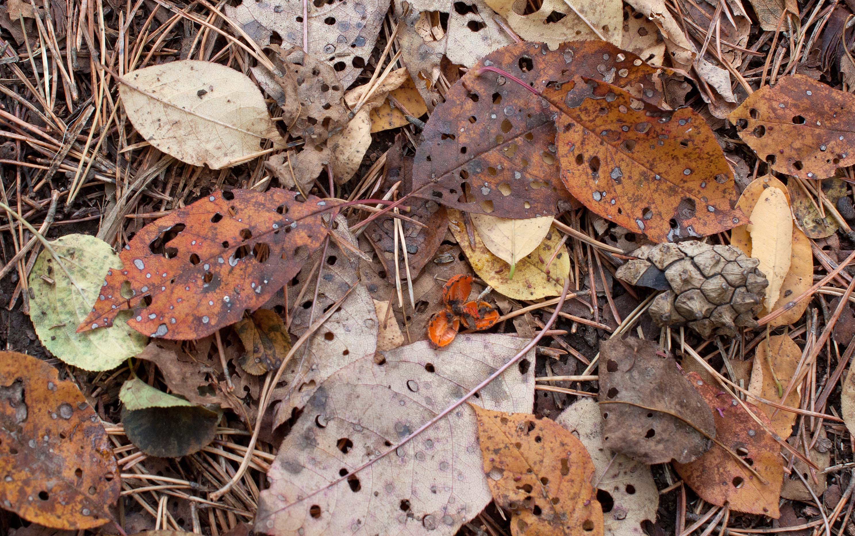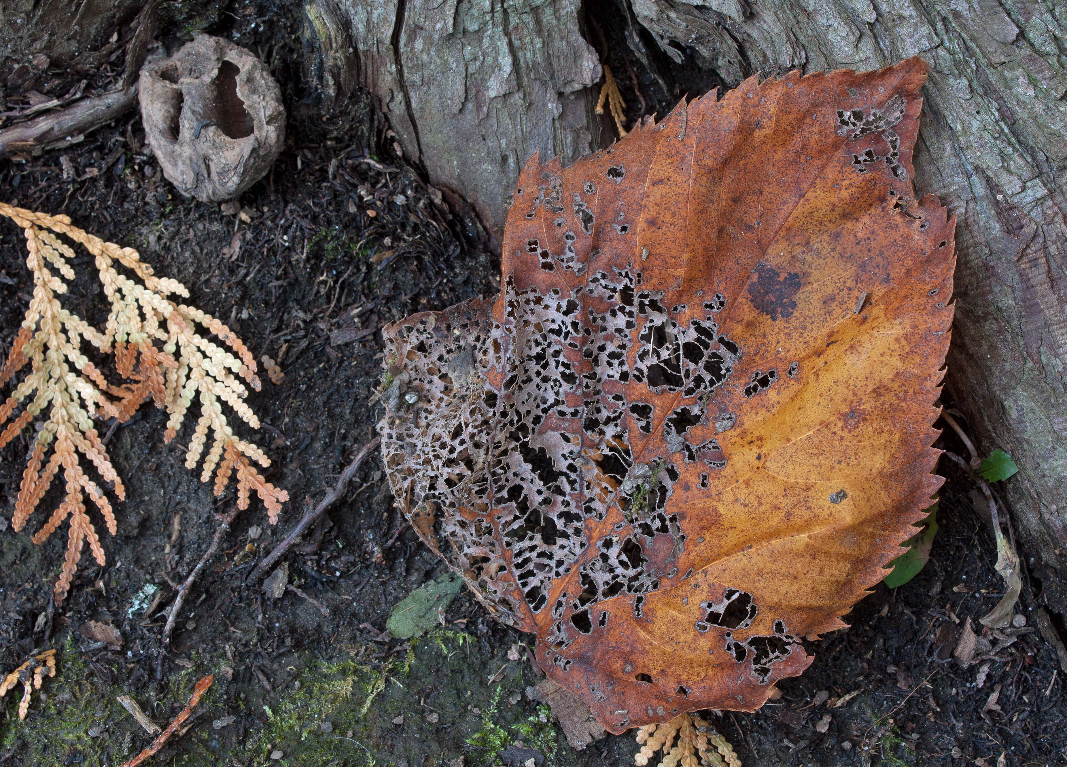 The dead leaves on the ground undergo strange transformations. Some had already changed colour from green to flaming reds and oranges or canary yellow or brilliant vermillion. Now fallen on the ground, turned grey or brown or even black, they transform again. Some of the leaves are mutilated, or skeletonized into reticulated patterns like delicate lace. Others have very round holes dug into them or chopped out of them. Yet others have ‘pimples’ or ‘potholes’ or blotches or smears of bubbling or jelly-like substances. All this depends on the agents at work: decomposers, saprotrophs, saprobic organisms. And all play a critical role in a larger and necessary phenomenon: decay. Decay is a vital transformation that ensures the health of the forest; decay is responsible for recycling usable nutrients back into the forest in a productive cycle of life. Agents of transformation include adult and larval invertebrates, fungi, protista and bacteria. All are responsible for continuing life on this planet by breaking down organic matter into usable nutrients—often used by the very same plants that donated the dead organic matter in the first place.