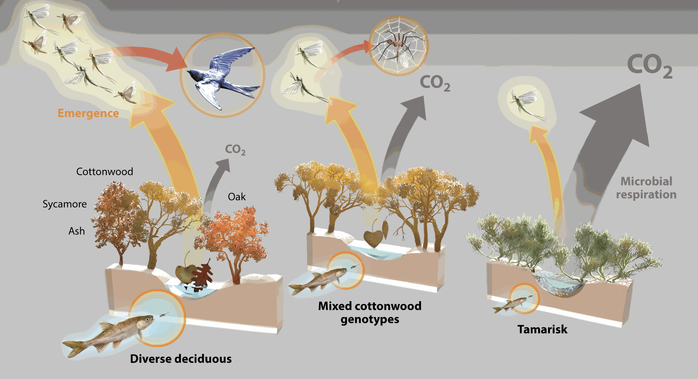 Global warming may promote monopolization of rapidly decomposing litter (e.g. tamarisk) over a diversity of slower decomposers (e.g. diversity of cottonwood, willow, oak, ash and sycamore) will decrease invertebrates and fish with implications to the bird population and others elements of a functional ecosystem.