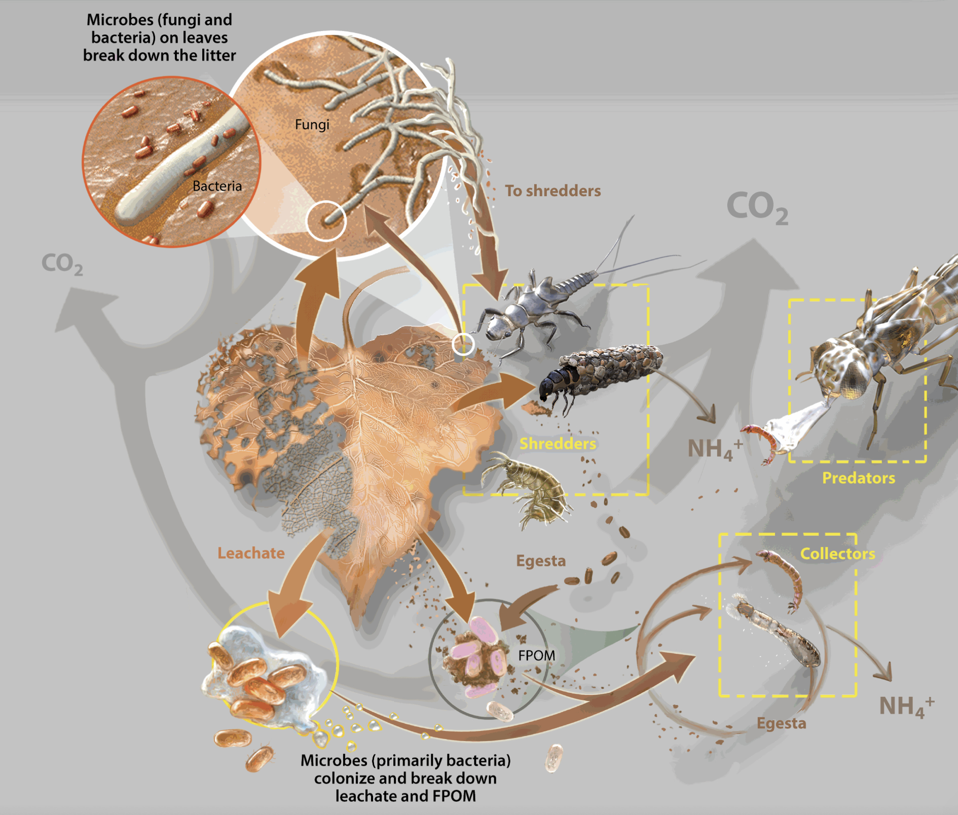 Leaves and branches that fall into streams from riparian trees and shrubs dominate that stream’s carbon budget. Litter breaks down through four main processes: leaching, mineralization by microbes, macroinvertebrate consumption, and fragmentation. Primary breakdown products carried out by bacteria, fungi, meiofauna, and invertebrates include leachate (dissolved organic compounds (DOM); think ‘tea’), fine particulate organic matter (FPOM), and inorganic matter.