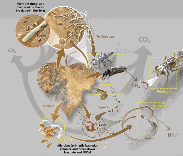 While algae pump carbon into the stream ecosystem via photosynthesis, annual respiration by freshwater microorganisms tends to exceed photosynthesis, contributing to carbon release. However, Wallace and colleagues tell us that a small but vital flux fuels a macroscopic food web: from detrivores and predatory invertebrates to fish, amphibians and mammals in the riparian habitat—all playing a role in the fate of that leaf and its various components such as carbon. Ultimately, “alternative pathways to different fates are shaped by traits and interactions of leaves, microbes, and macroinvertebrates, all sensitive to a changing environment.”