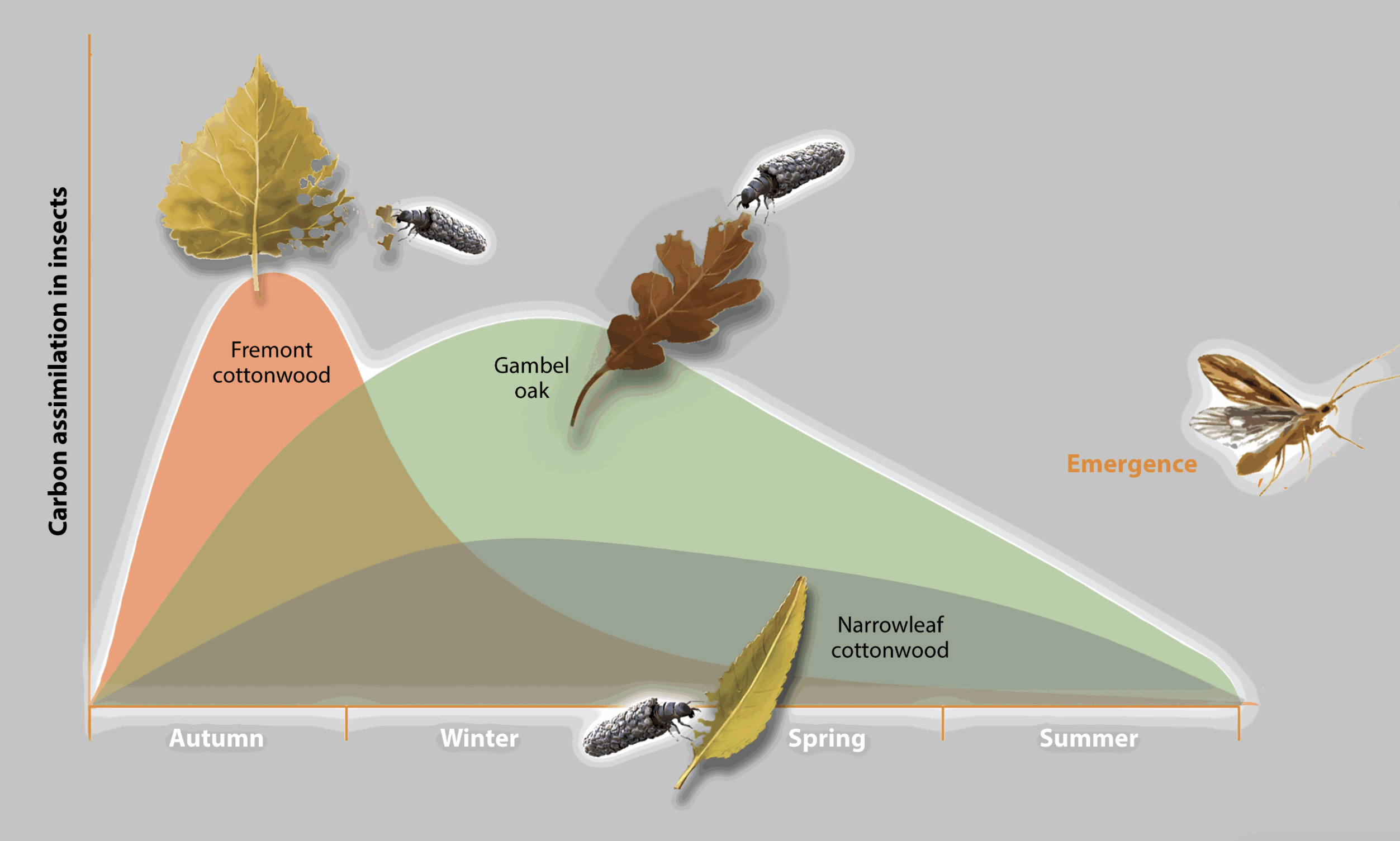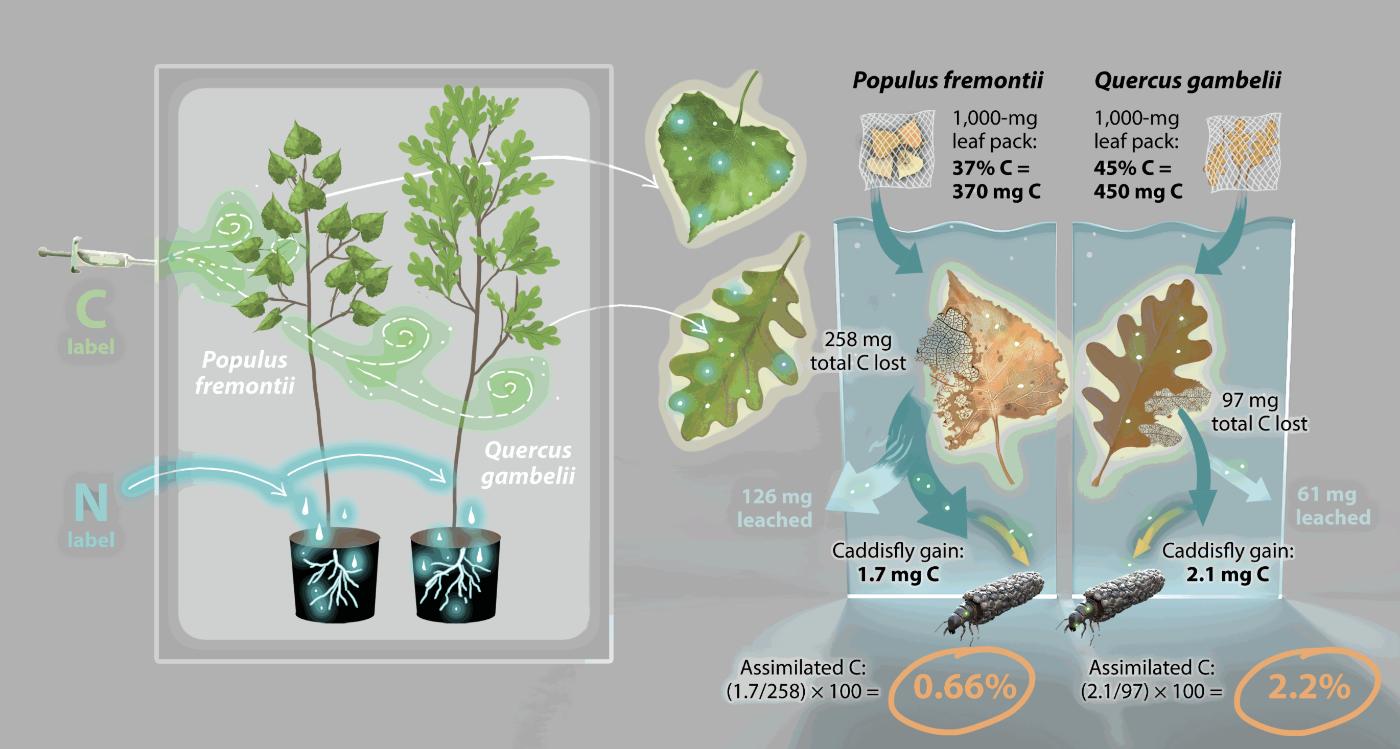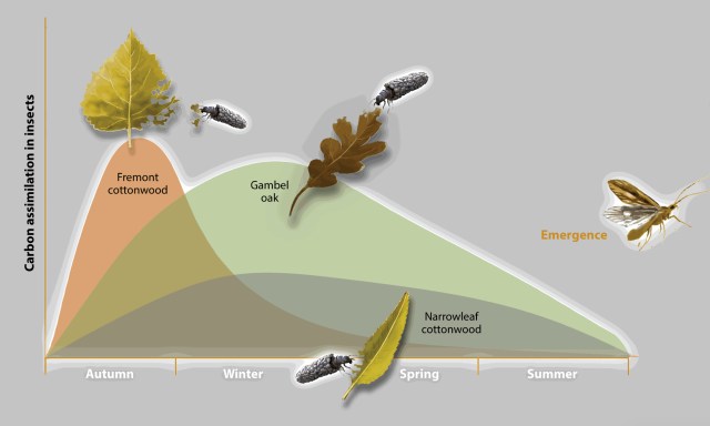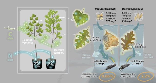 Grubbs & Cummins showed that leaves that decompose at different rates provide a continuum of resources for shredders throughout their life cycles. Isotope studies by Siders et al. showed that rapidly decomposing litter, such as leaves of Fremont cottonwood, provides a rapid but brief pulse of carbon and nitrogen to invertebrates shortly after leaf fall; in contrast, slowly decomposing litter (e.g. oak leaves) provides a more sustained flux and nourishment for macroinvertebrates in streams, and transferring more carbon up the food chain.