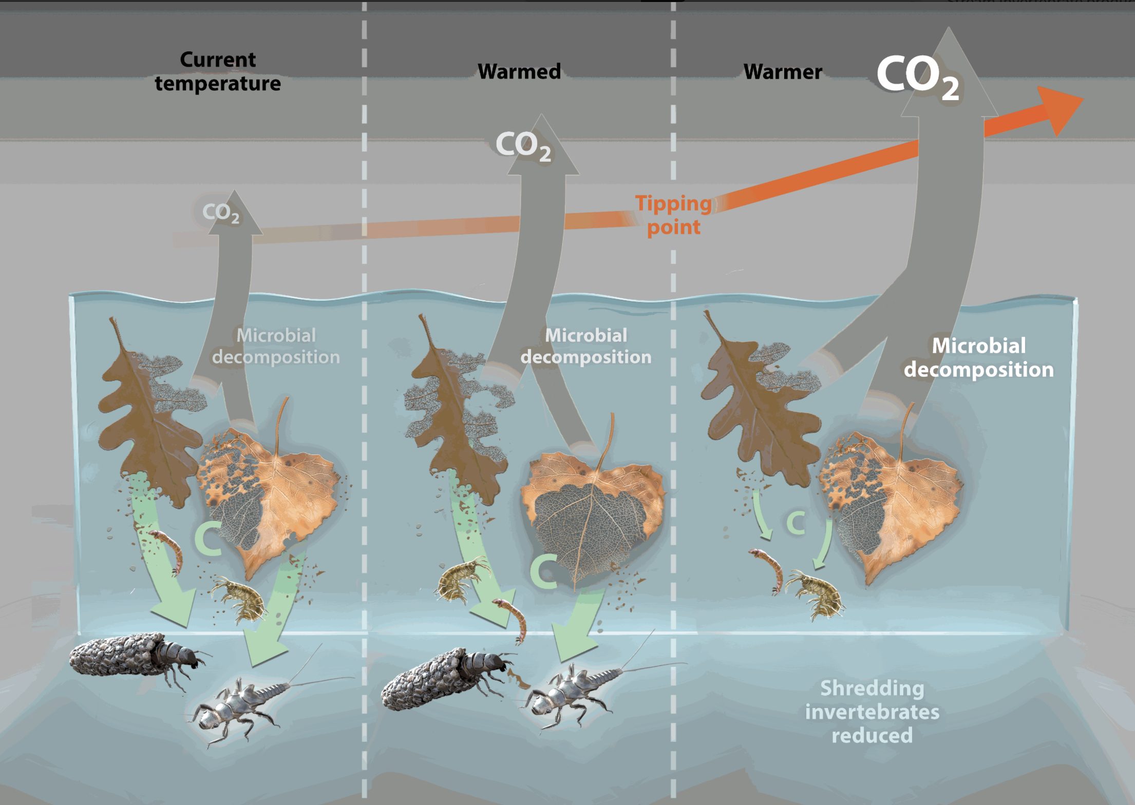 The reduction in trophic complexity due to global warming may shift the balance between macroinvertebrate vs microbe pathways of decomposition, favouring microbial processing. Marks argues that climate warming will cause invertebrate species decline, reducing the diverse response to litter breakdown, and more organic matter will be processed by microbes, increasing carbon export out of streams as carbon dioxide. In hypereutrophic streams, often associated with agricultural and industrial pollution, macroinvertebrates will be excluded by the loss of oxygen that accompanies these, while bacteria may still thrive. As temperature rises, decomposition rates initially rise and promote growth of decomposers and grazers; with increased temperature a tipping point is reached in which macroinvertebrates are excluded and microbial decomposition promoted through collateral effects (e.g. loss of oxygen and changes in nutrient limitation).