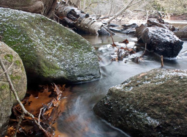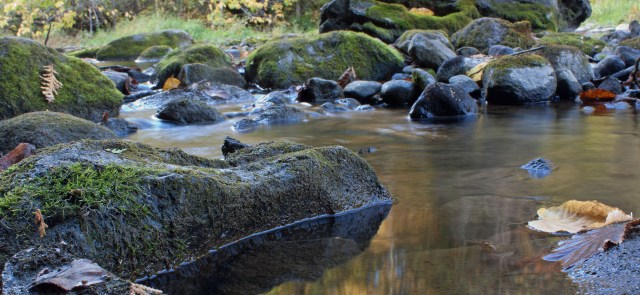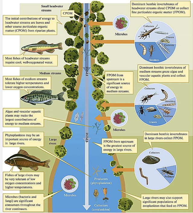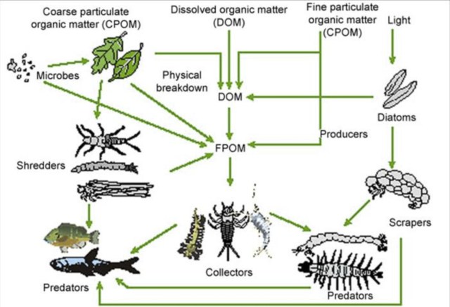 Small headwater streams are heavily influenced by the riparian zone (terrestrial area adjacent to the stream). Not only does this cover provide shade, which cools the stream; it also provides the chief form of energy as allochthonous energy through leaf fall—referred to as coarse particulate organic matter (CPOM). This CPOM, in turn, feeds the fungi, algae and macroinvertebrates (shredders and scrapers such as stoneflies, mayflies and some caddisflies) in the stream; these break down the leaves into smaller pieces as they decompose and are consumed. The broken down CPOM becomes FPOM (you guessed it; fine particulate organic matter), which is captured by collector macroinvertebrates such as net-spinning caddisflies. As it moves downstream, the organic matter continues to break down until it finally moves from particulate organic matter (POM) to dissolved organic matter (DOM).