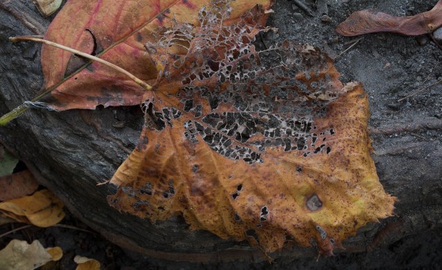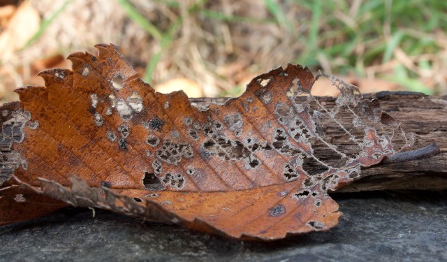 Leaf skeletonization is primarily carried out by a combination of fungi, bacteria, and invertebrates that break down the softer leaf tissue (pulp), leaving only the tough, lignin-rich veins behind. Lignin, by the way, forms the cell walls of most plants and forms 20-35 % of the dry mass of wood; this tough substance resists being dismantled by fungi and bacteria. The leaf’s decay process occurs at different rates according to climate, and soil conditions. The size, thickness, structural and chemical composition of a leaf also plays a role. For instance, leaves with more lignin will decay more slowly. Levels of suberin and cutin—waxy water-resistant compounds on leaf surfaces—also tend to slow decay. Typical leaf skeletonizers belong to what one site calls “members of the FBI“—fungus, bacteria and invertebrates):