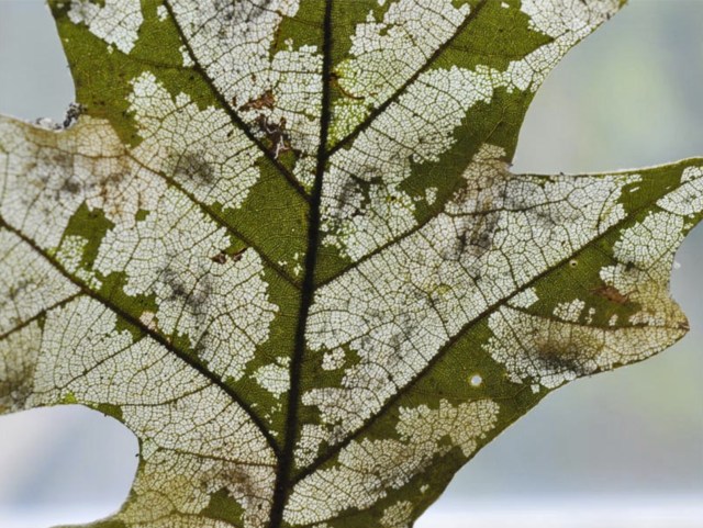 Invertebrates are the most common leaf skeletonizers, usually the larval (caterpillar) stage of many moth species, but adult beetles and sawflies also contribute to this type of damage. Leaf skeletonization can occur on still living leaves by adult insects and their larvae (e.g. Japanese beetles), which scrape off the green tissue, avoiding the veins, and giving the leaf a stained-glass appearance. While damage to large, healthy trees is often just cosmetic, heavy or repeated infestations can weaken plants. Examples of some common invertebrate leaf skeletonizers and their preferred host include: