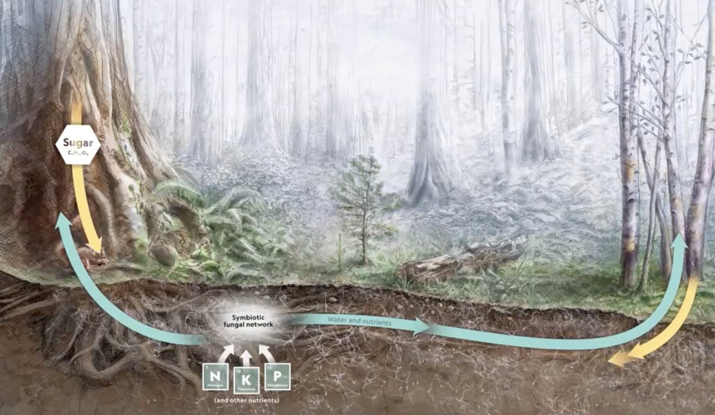 Fungi start the decomposition process by secreting enzymes that break down these complex organic compounds (e.g. cellulases to break down cellulose and hemicellulose), releasing essential nutrients—carbon, nitrogen, water, and others—back to the soil, where they become available to living plants. The fungi further this process by forming underground symbiotic relationships with plant root systems—called mycorrhizal networks—directly transferring nutrients to where they are needed.