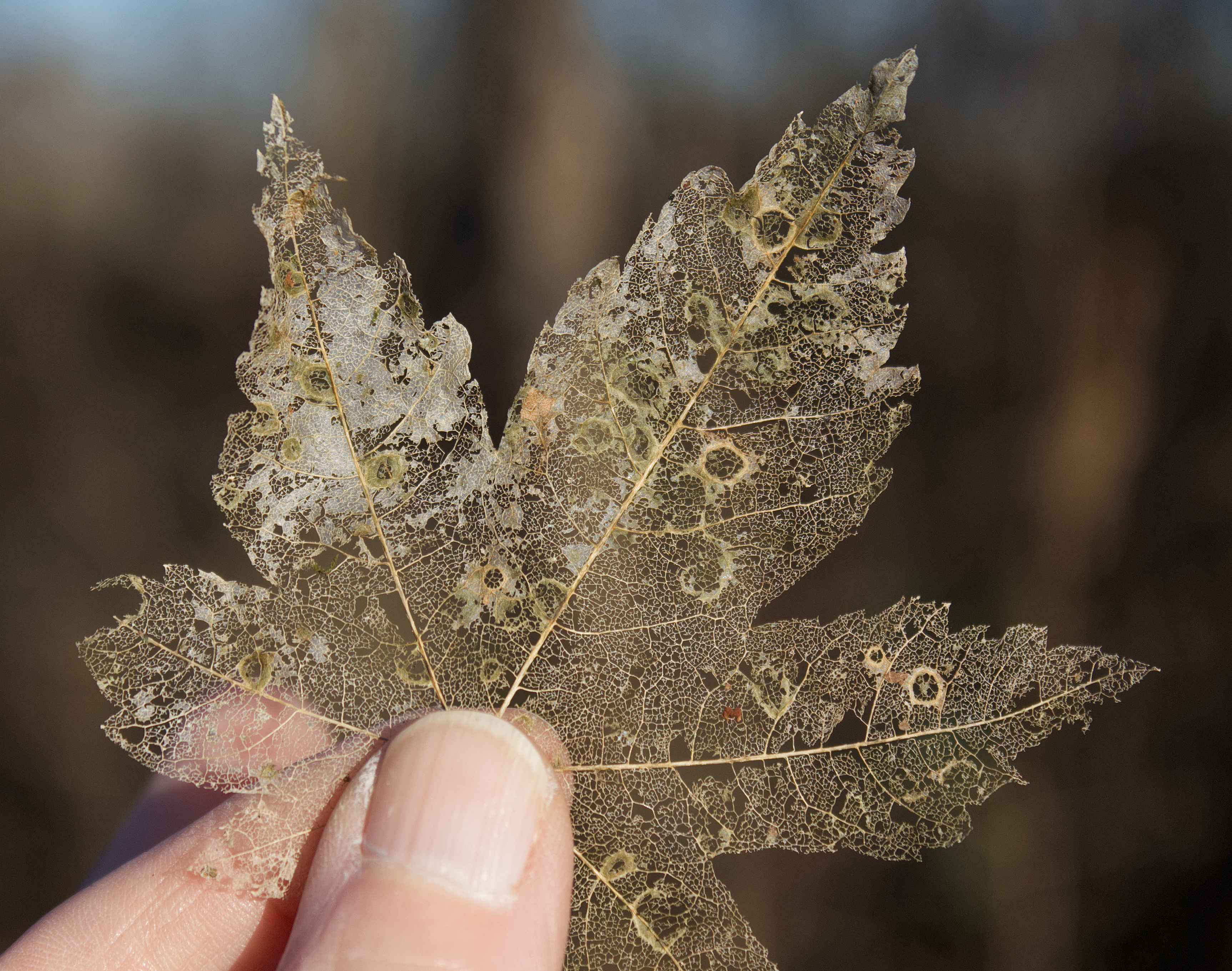 Saprophytic Fungi play a major role in leaf skeletonization of fallen leaves. They are the ecosystem’s primary decomposers and the only organisms capable of efficiently breaking down lignin and cellulose—major structural components of plant cell walls that make the veins resistant to decay. Fungi (particularly white-rot fungi) are the only major organism that can breakdown lignin, a complex polymer in wood, preventing woody debris buildup.