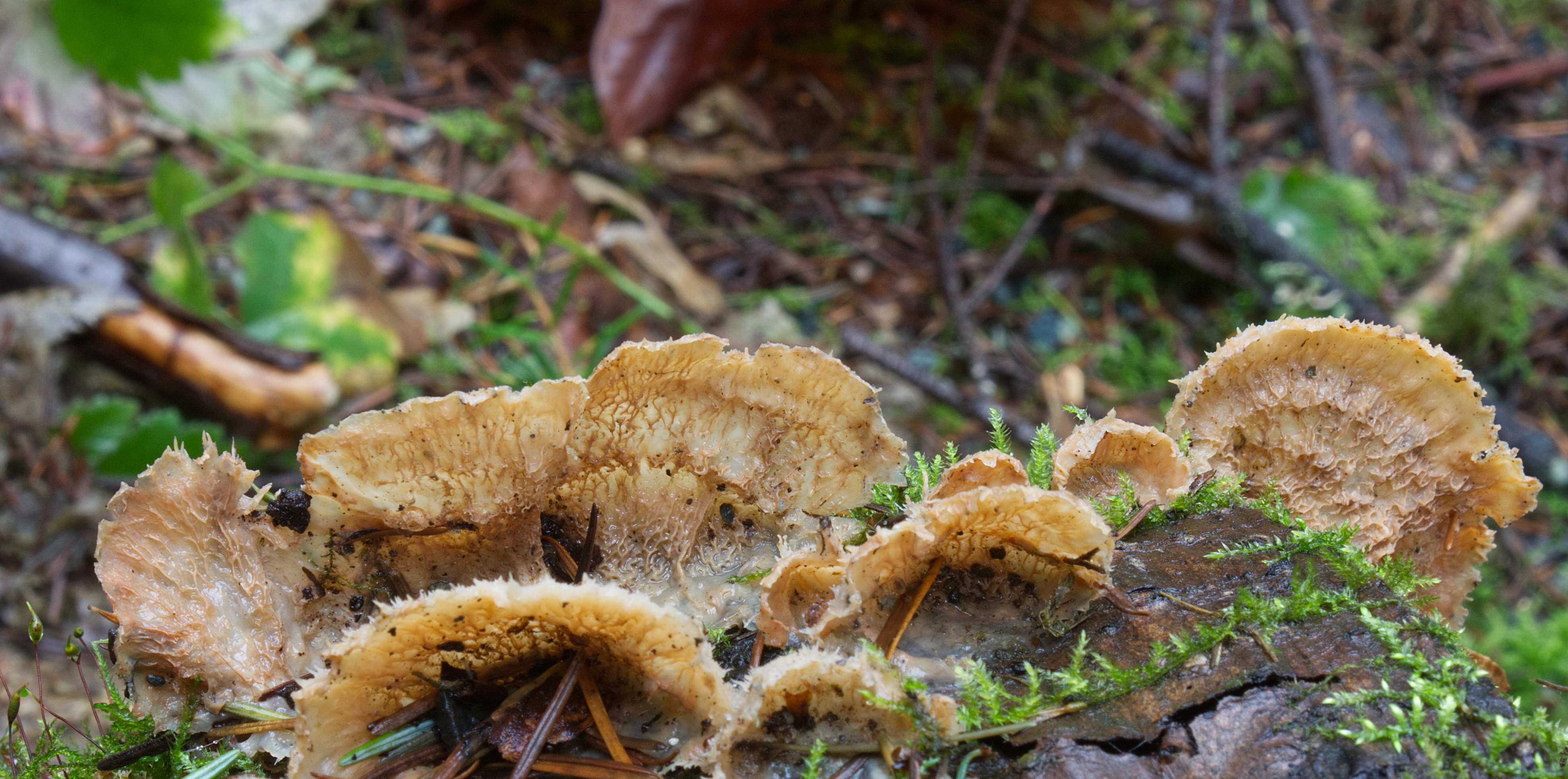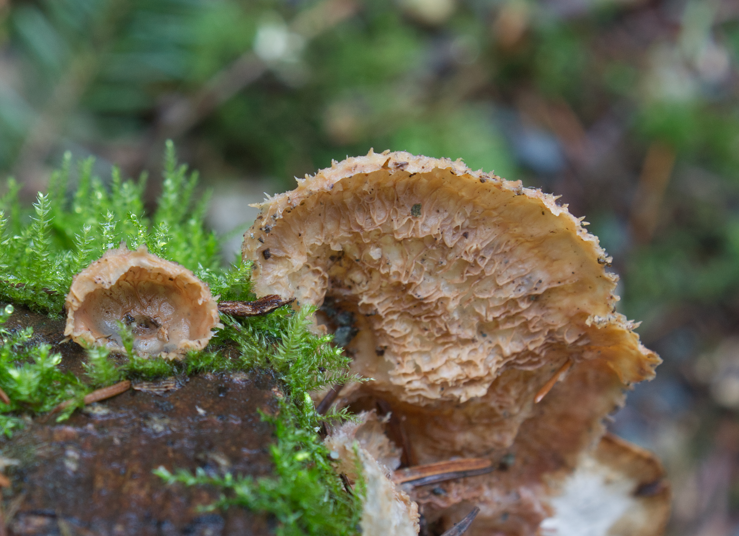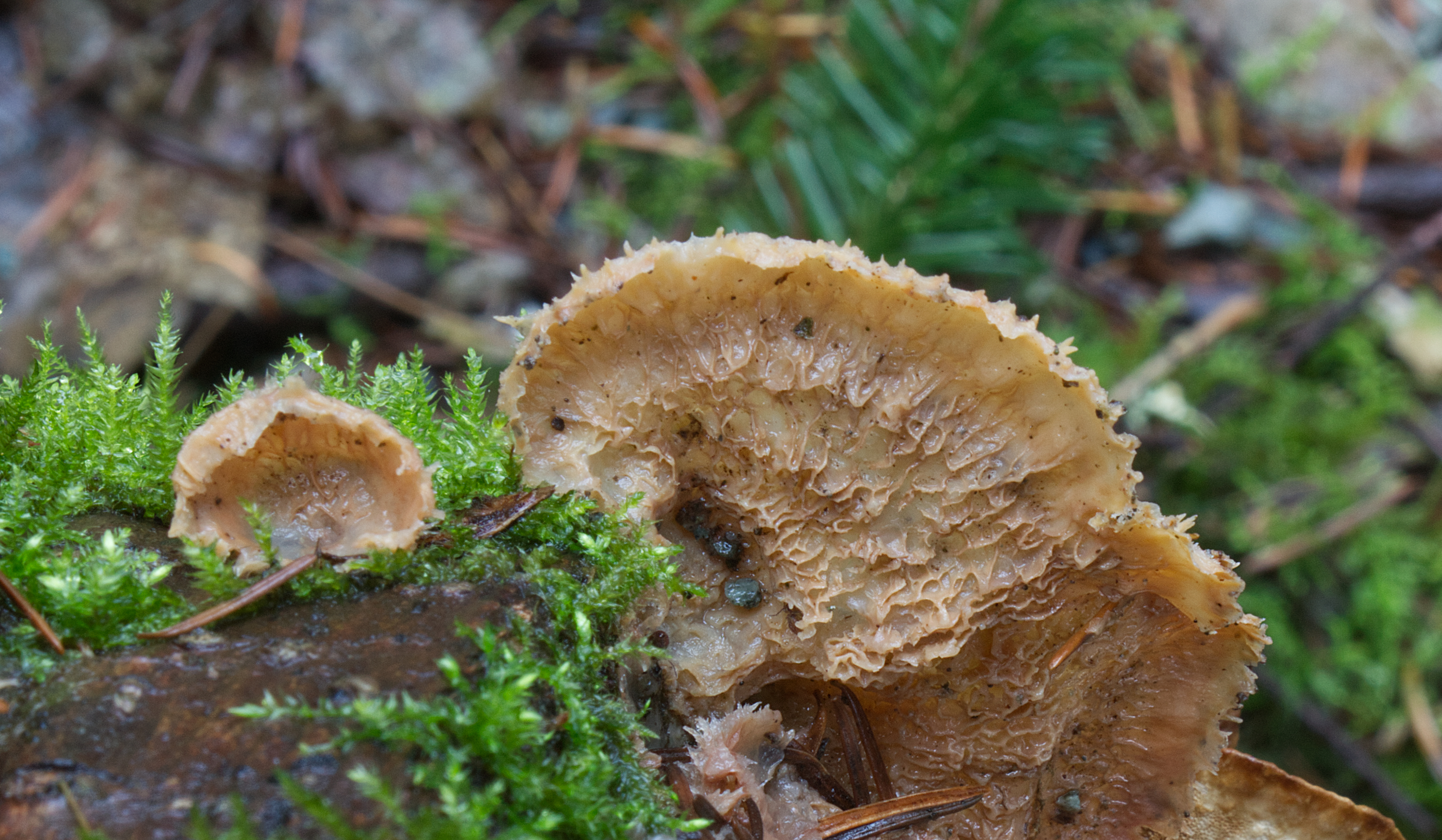 On a recent walk through the Campbell Valley Park forest, I encountered a strange fungus growing on a mossy Big Leaf Maple log. It was rubbery and all wrinkled and hairy, making me wonder if it was even a fungus. Where were the pores or gills to hold the spores? The wrinkled side looked positively brain-like and intrigued me. I got the impression I was looking at a mature dried form; nearby, I saw what looked like younger versions, still wrinkled but almost porous with almost translucent pinkish jelly-like portions.