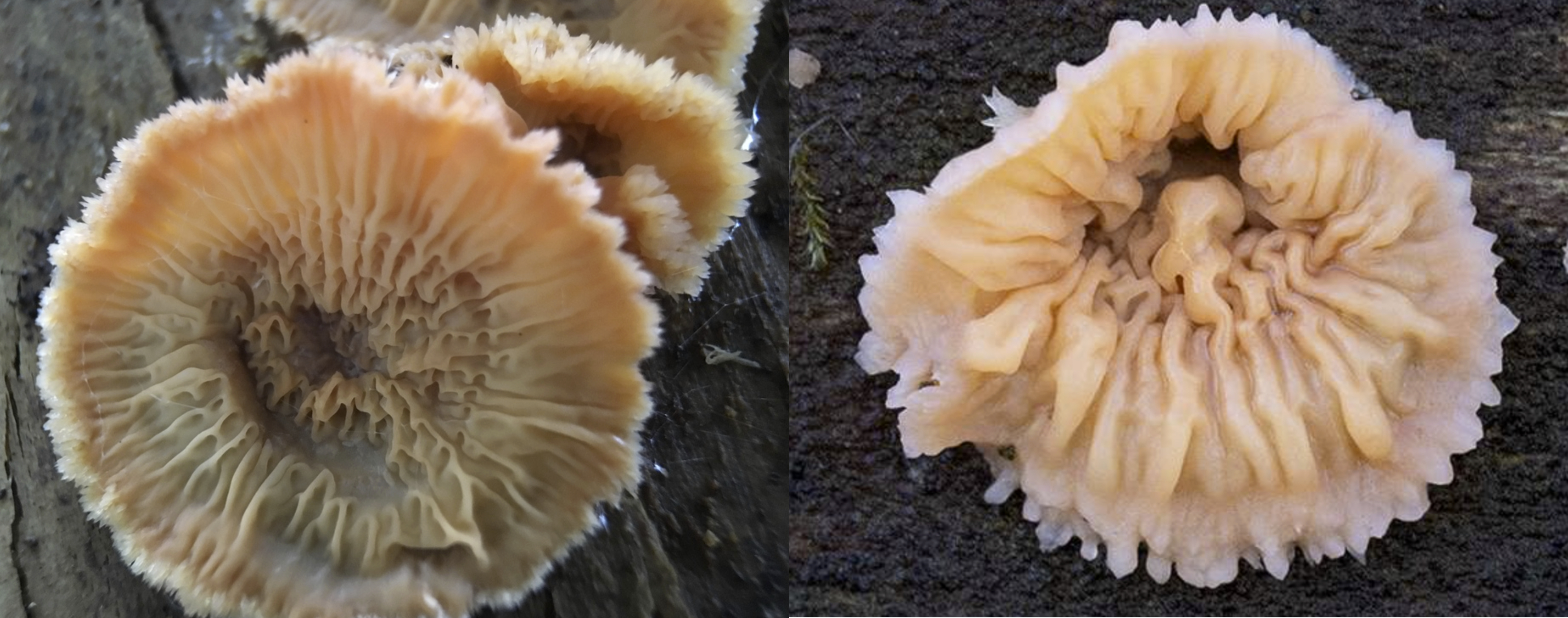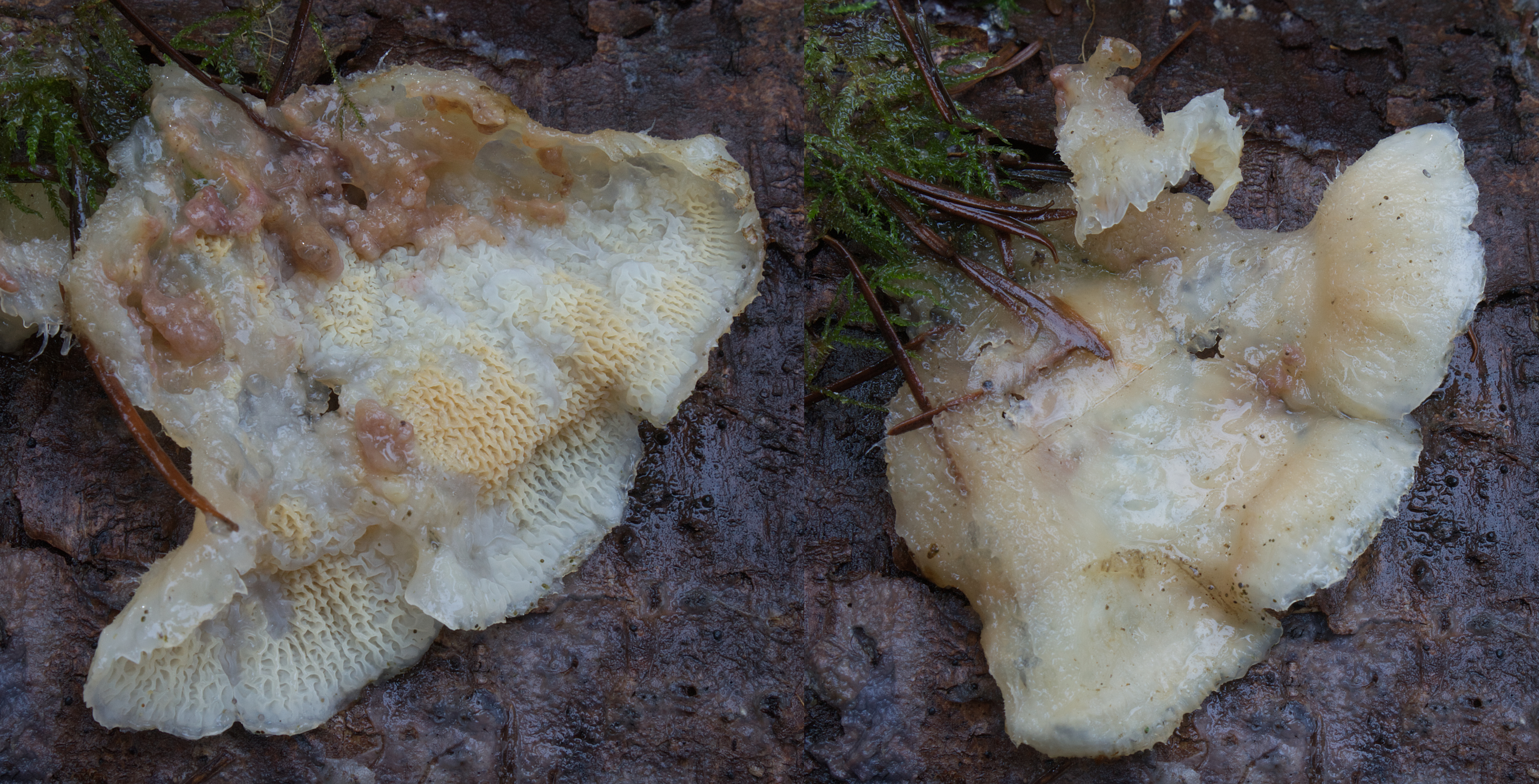 The fruiting bodies of this wood-rotting fungus are stalkless fan-shaped to semi- or almost circular spreading crusts with a spongy to fibrous texture. They are often resupinate (meaning) and often overlapping and emerging to each other. The upper non-fertile surface is pale and hairy or wooly with a usually white to translucent margin. The fertile undersurface with spore-bearing hymenium has wrinkled ridges and cross veins (instead of pores or gills), with a colour that ranges from yellow-orange to pinkish orange. The flesh is gelatinous and white to yellow.